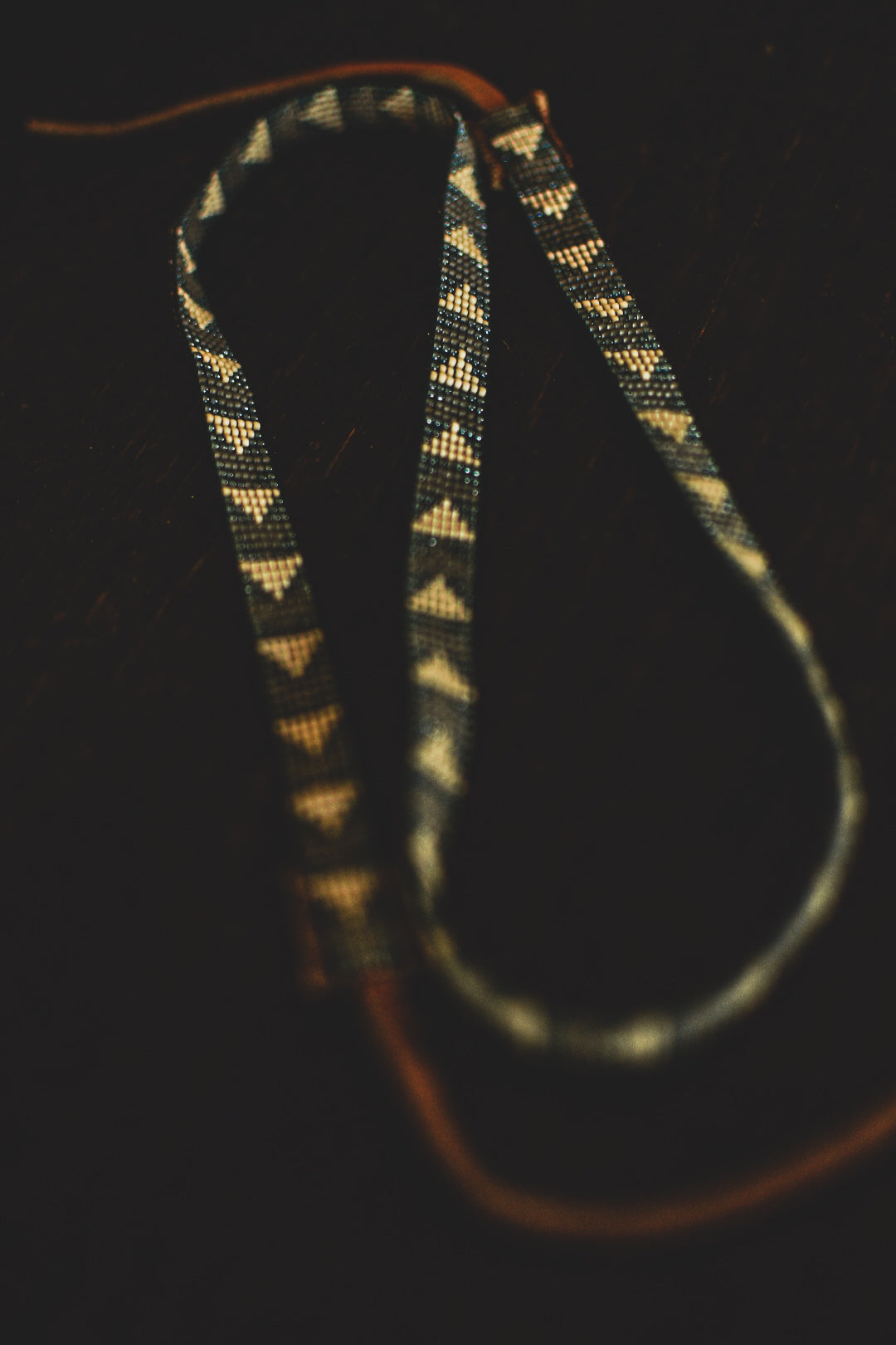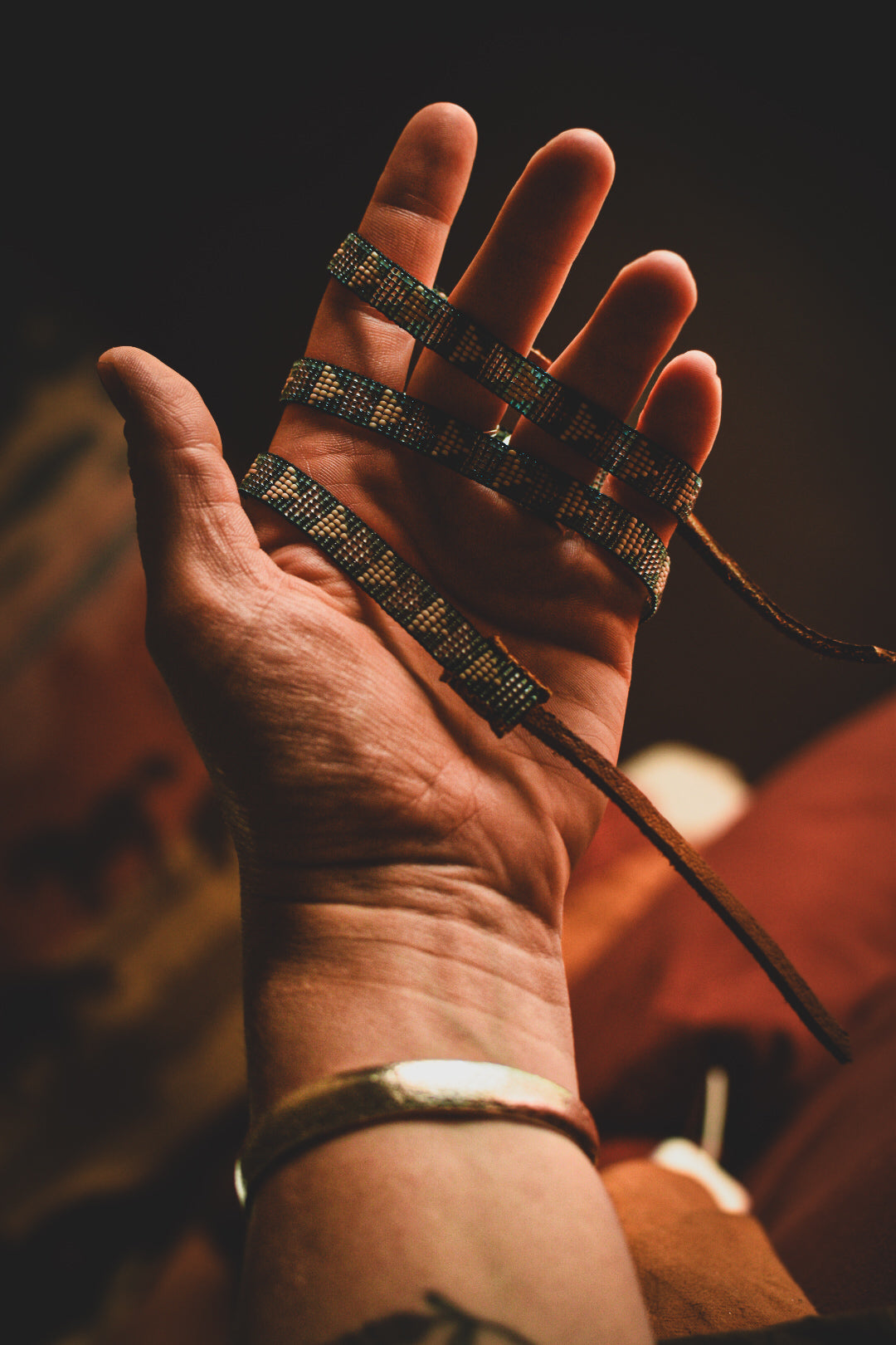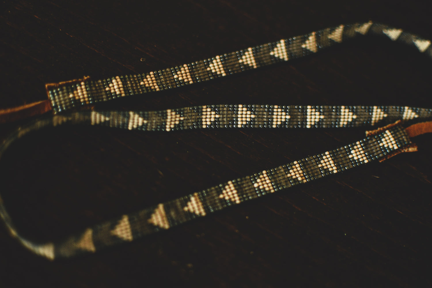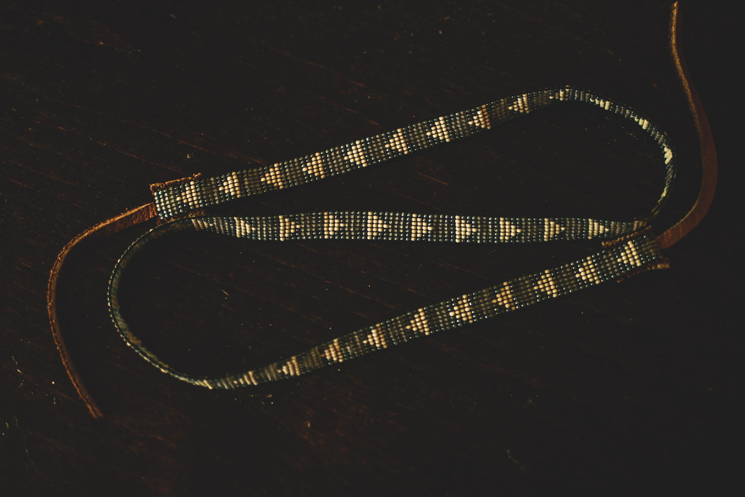 Transparent blue and white glass beads with tobacco colored American elk hide leather ties. Made by hand with the intention of being heirloom quality in Montana, USA.