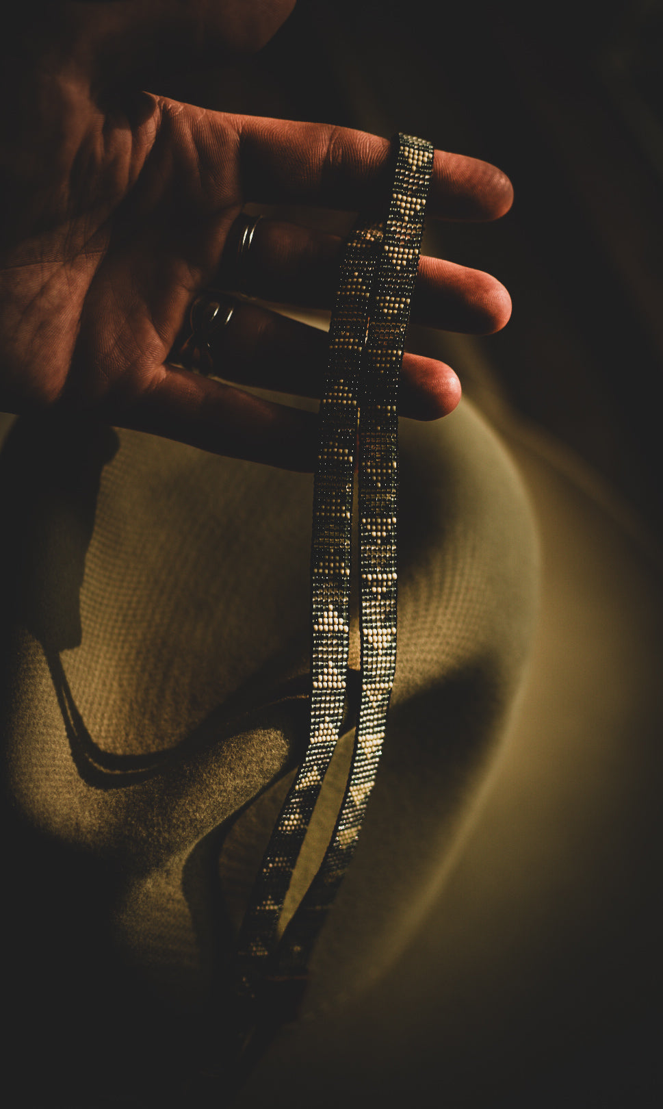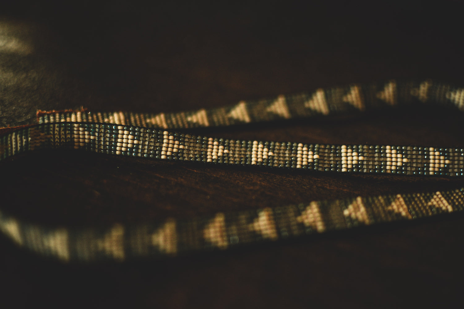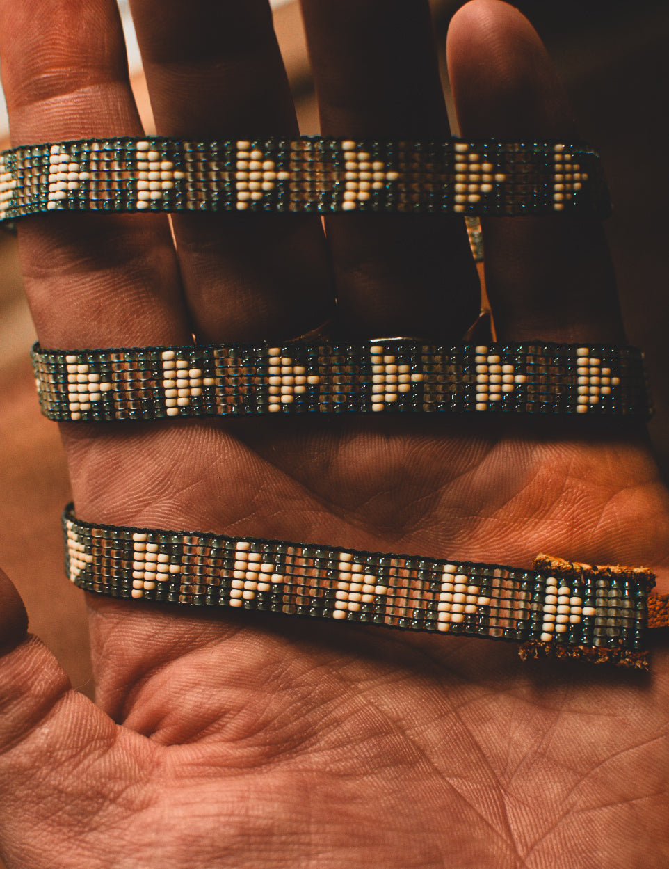 Transparent blue and white glass beads with tobacco colored American elk hide leather ties. Made by hand with the intention of being heirloom quality in Montana, USA.