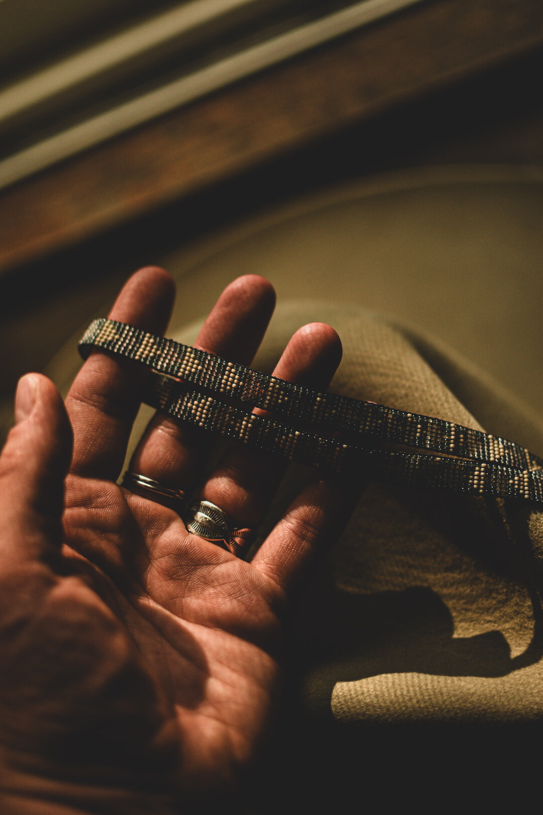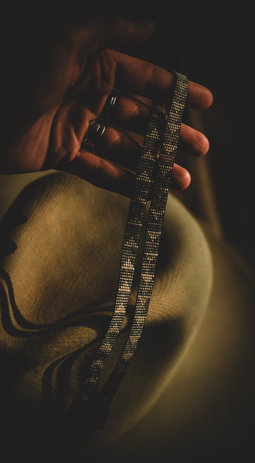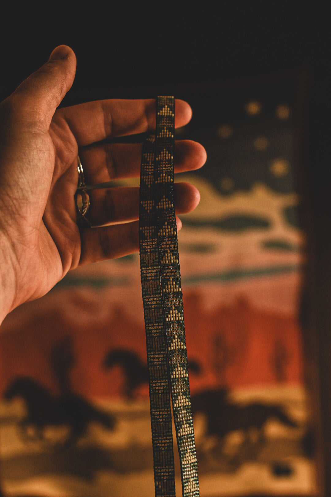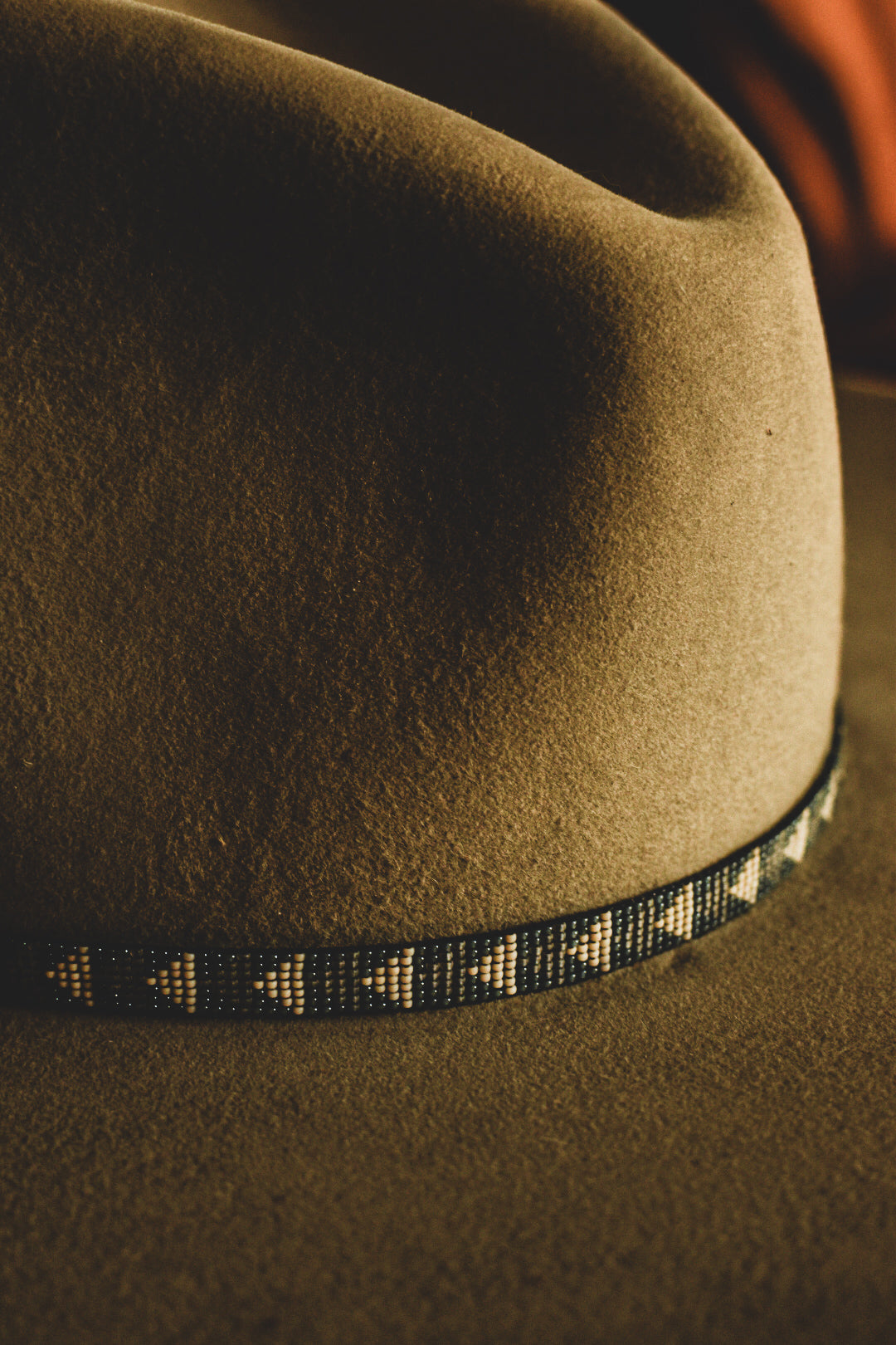 Transparent blue and white glass beads with tobacco colored American elk hide leather ties. Made by hand with the intention of being heirloom quality in Montana, USA.