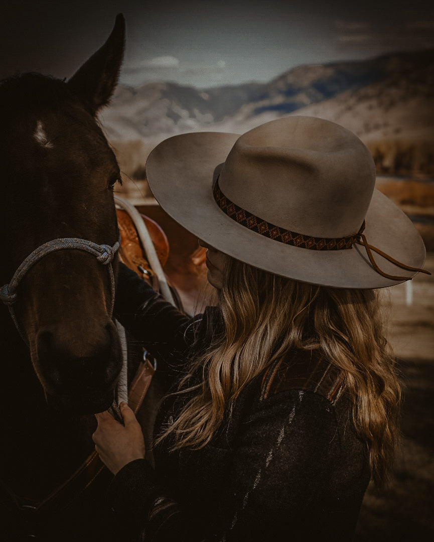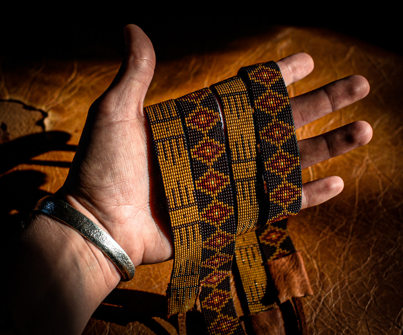 Matte chocolate, red and mustard tone glass beads. Tobacco colored American elk hide leather ties. Made by hand with the intention of being heirloom quality in Montana, USA.