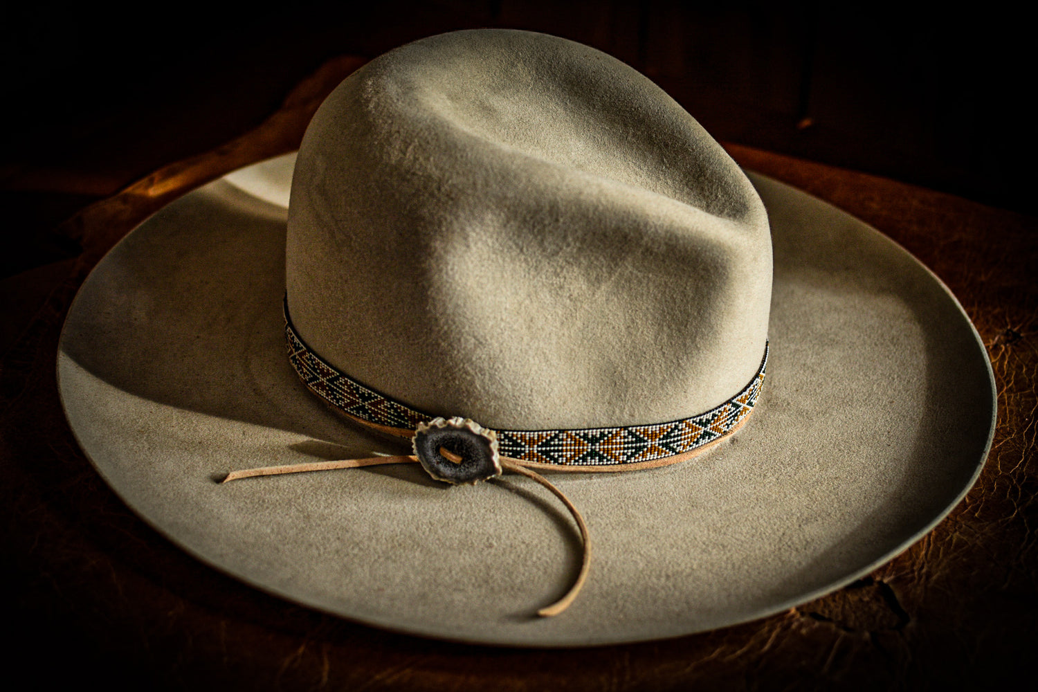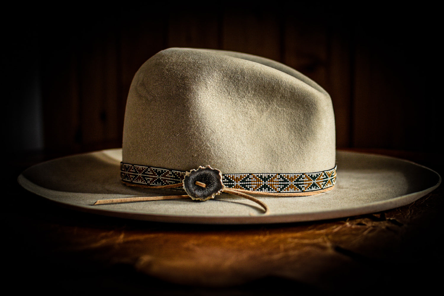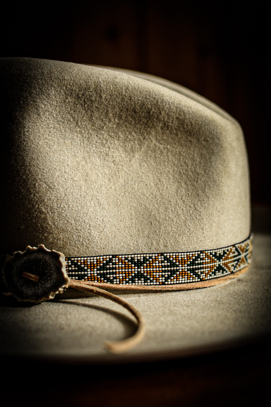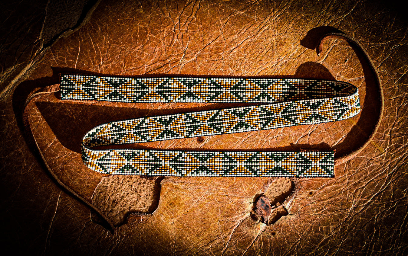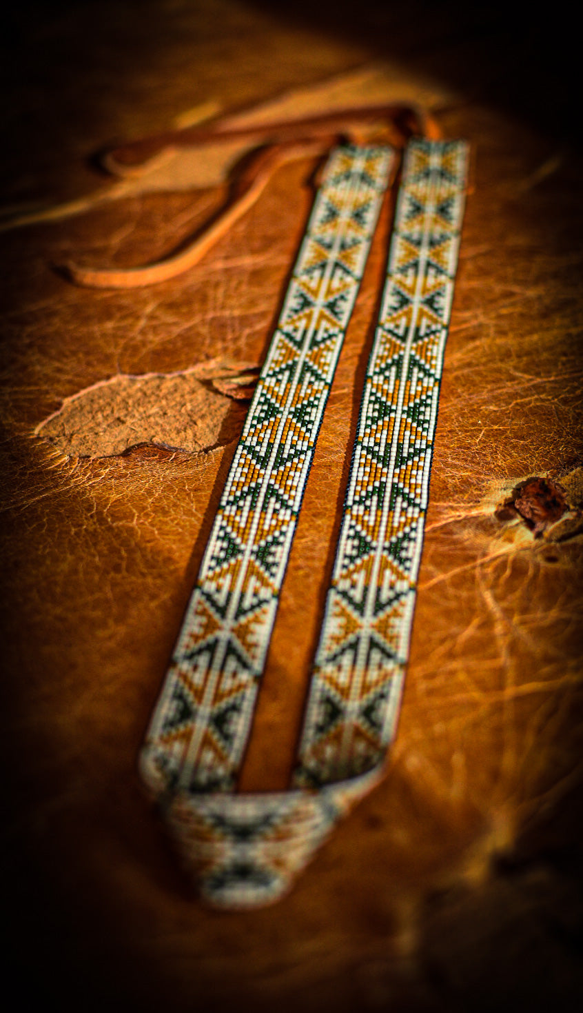 Matte white, olive green and golden glass beads. Tobacco colored American elk  hide leather ties. Made by hand with the intention of being heirloom quality in Montana, USA.
