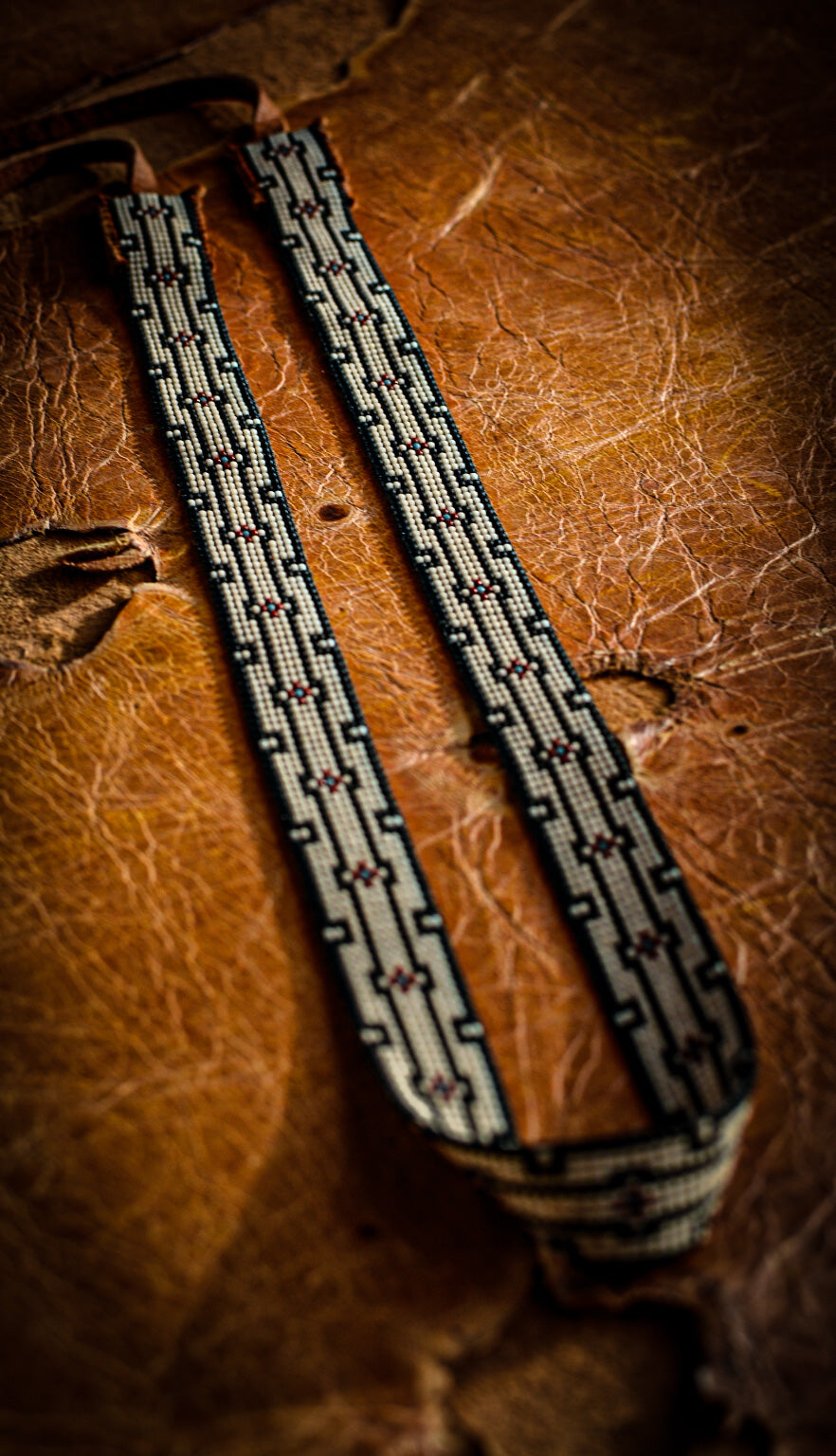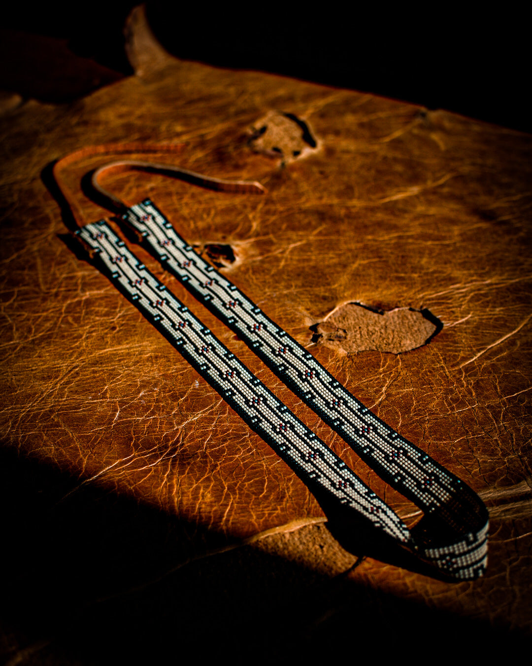White, black, blue + red glass beads with tobacco colored American elk hide leather ties.