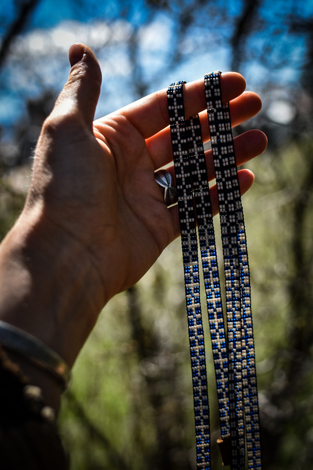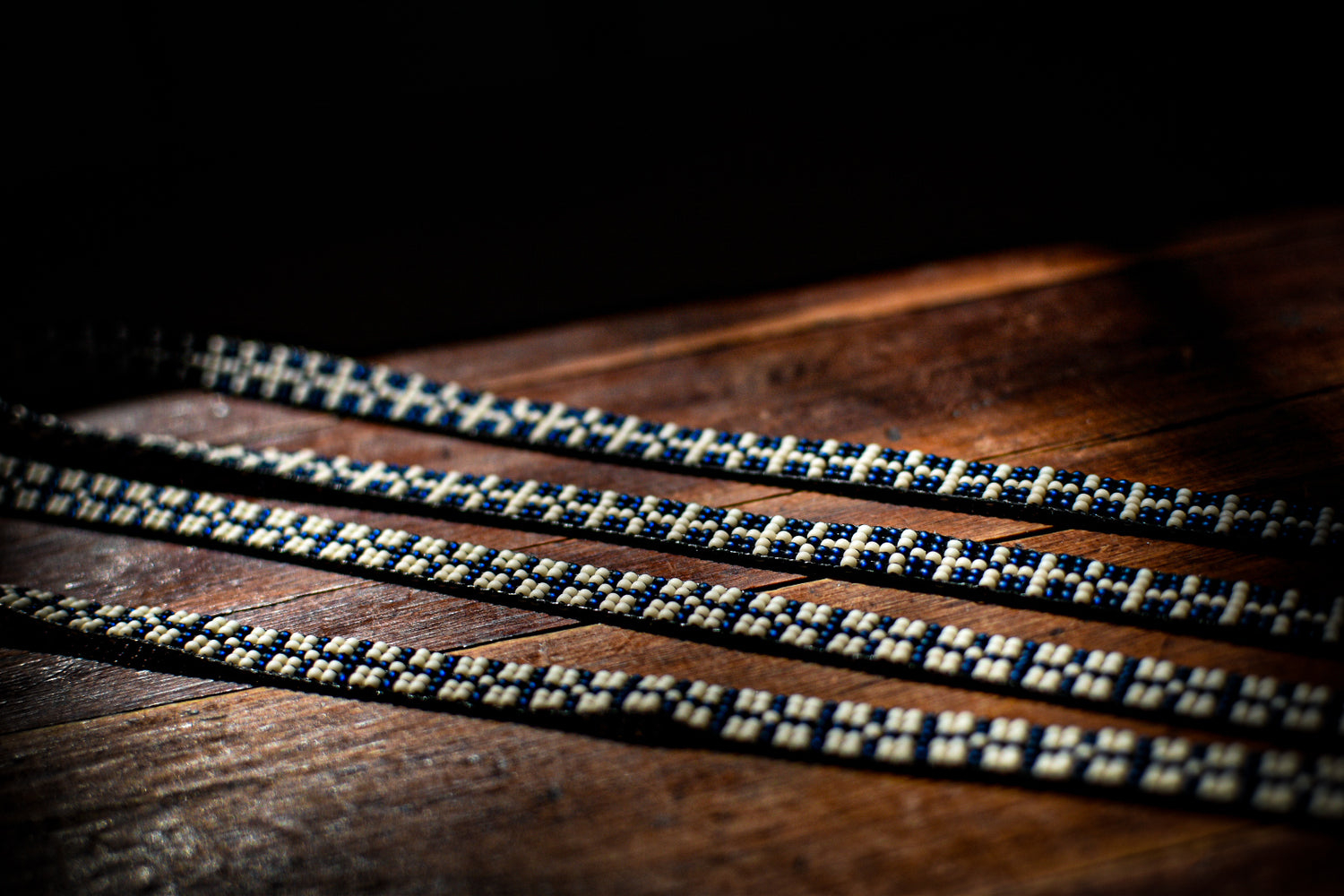 Matte transparent blue and white glass beads with tobacco colored American elk hide leather ties.