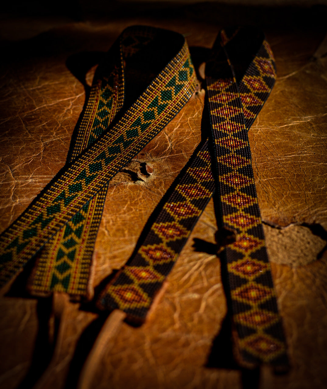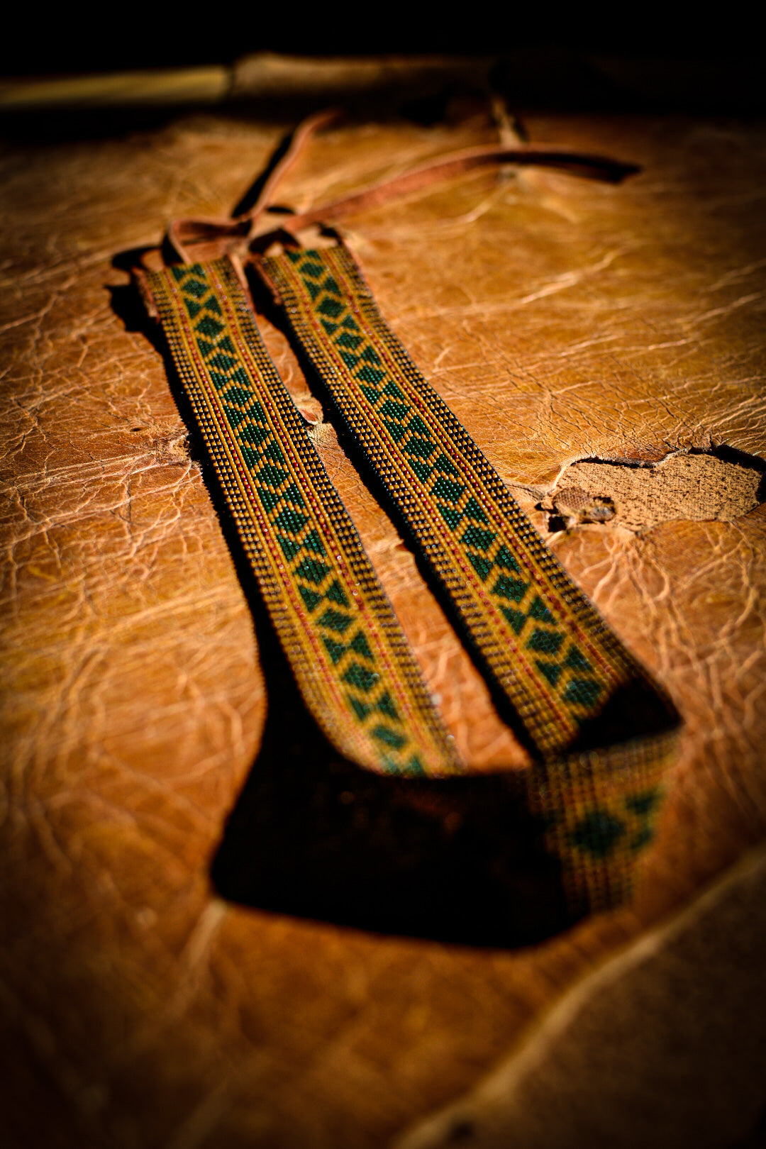 Chocolate, olive + warm toned glass beads with tobacco colored American elk hide leather ties. Made by hand with the intention of being heirloom quality in Montana, USA.