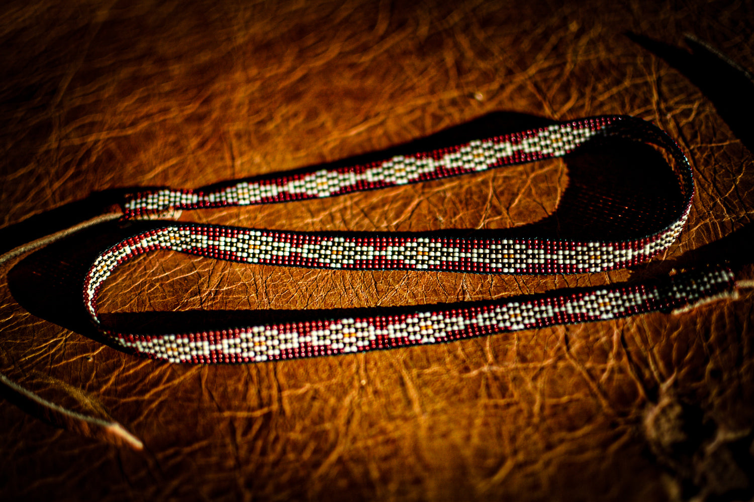 Red, white, mustard and bronze beads with tobacco colored American elk hide leather ties.