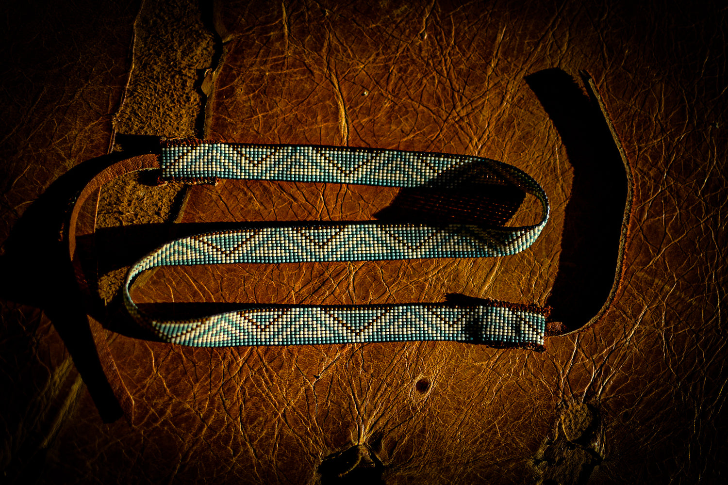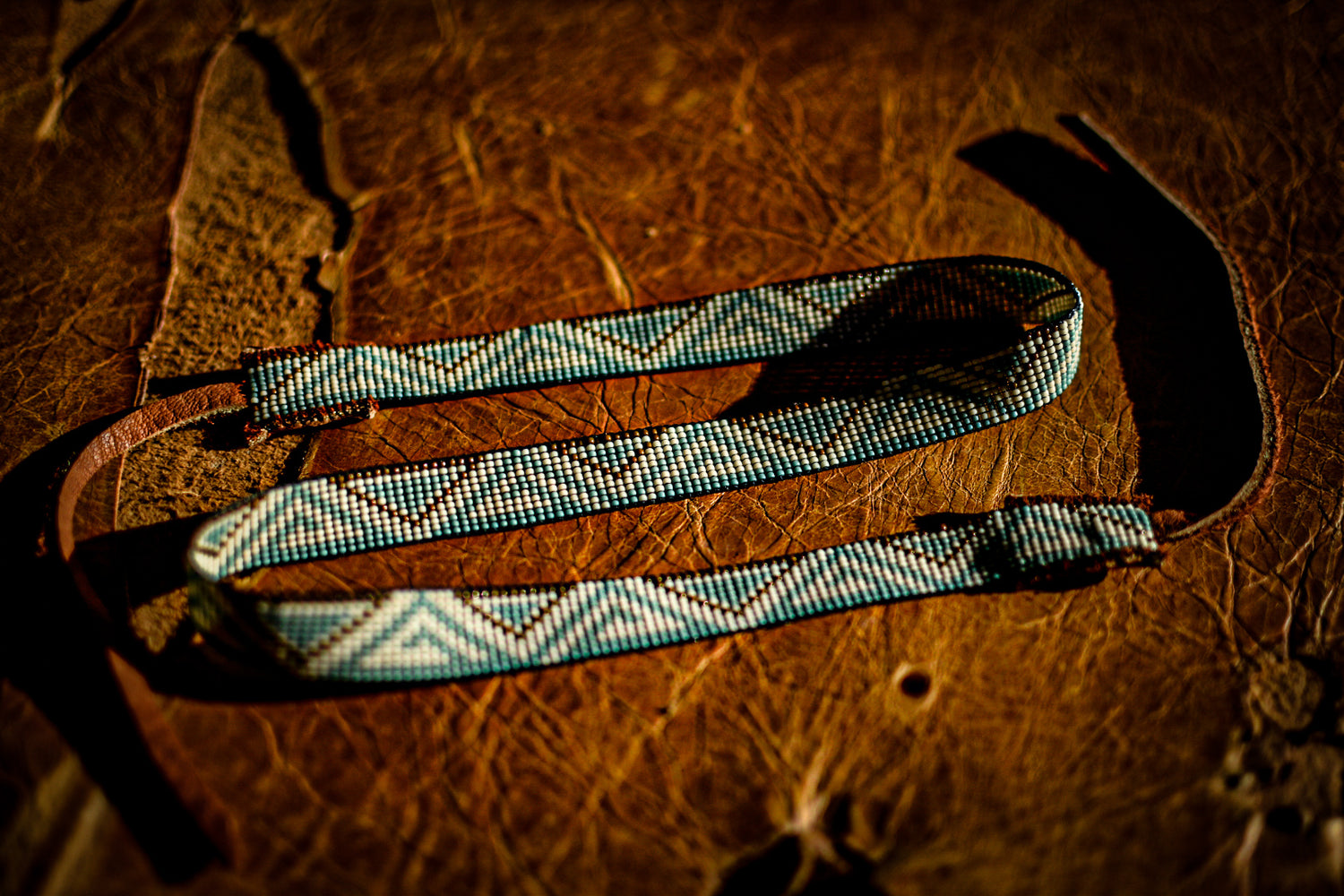 Light blue, cream and brown beads with tobacco colored American elk hide leather ties.