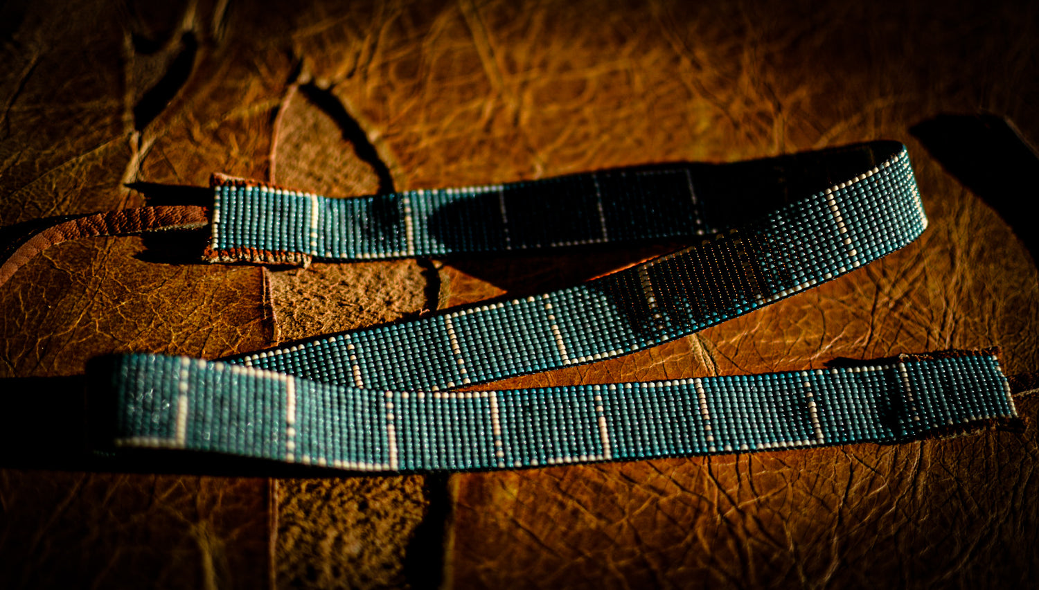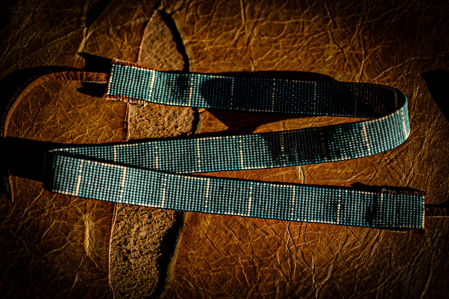 Blue and cream beads with tobacco colored American elk hide leather ties.