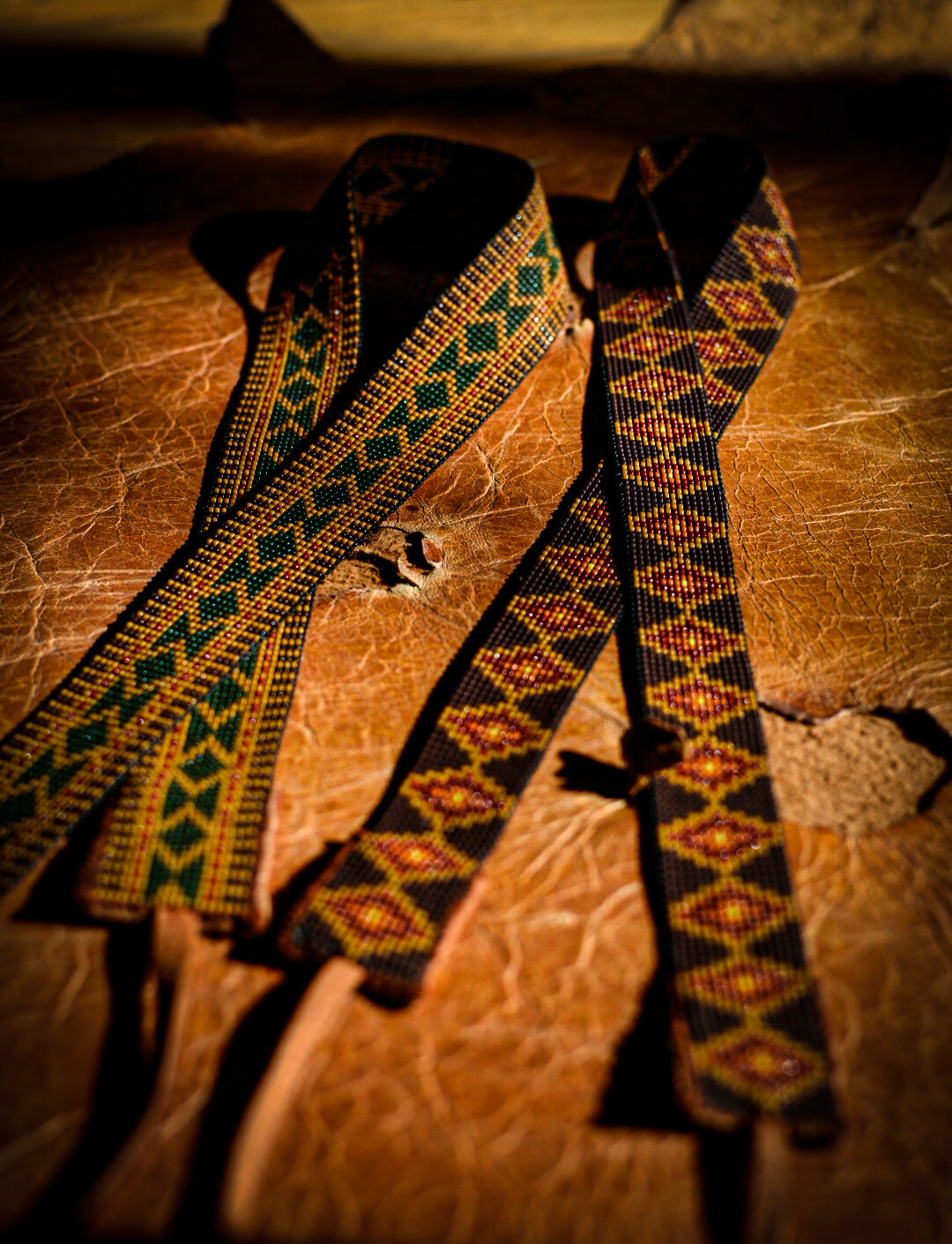 Chocolate, olive + warm toned glass beads with tobacco colored American elk hide leather ties.