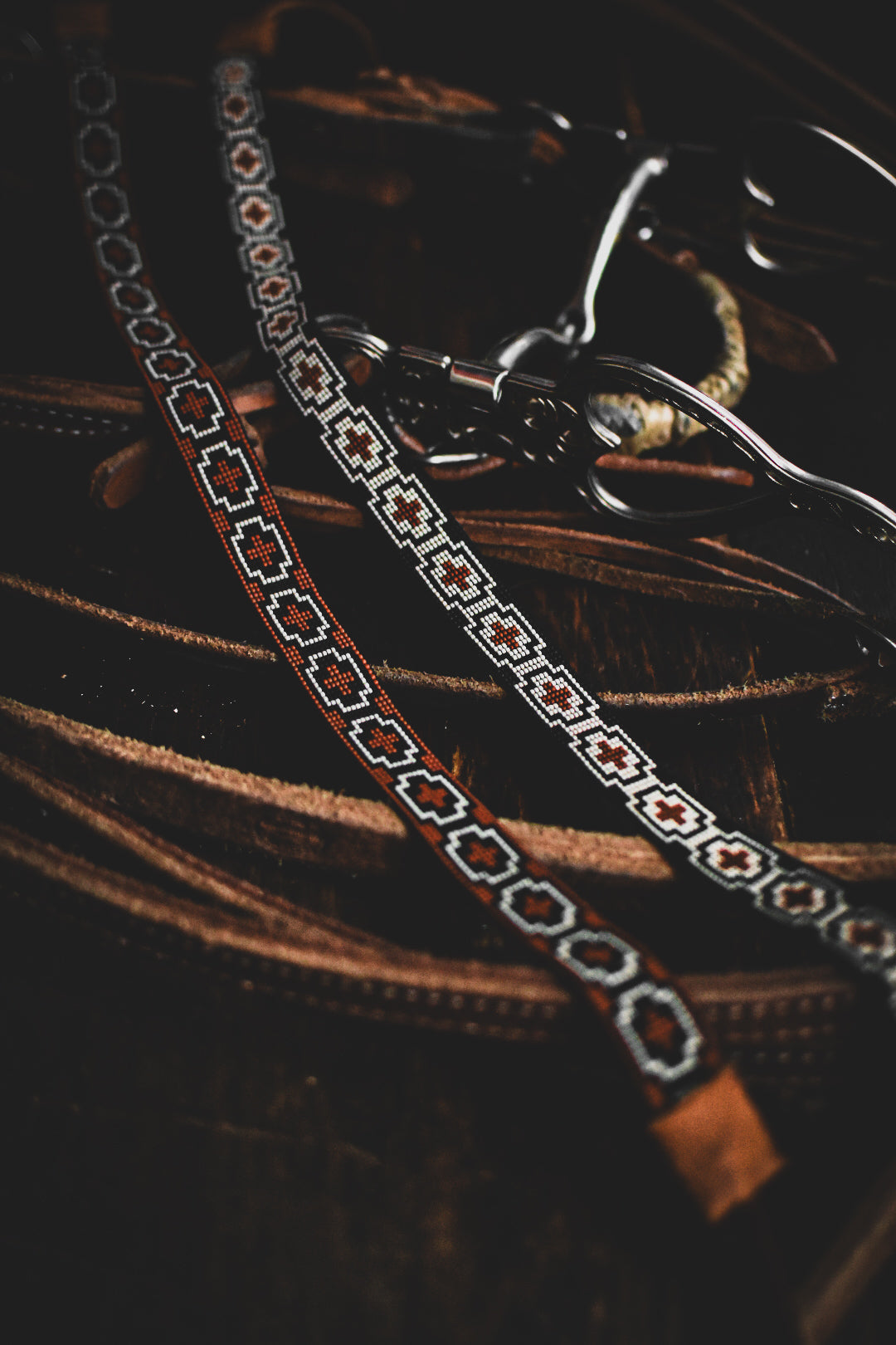 Rust, black, and white glass beads with tobacco colored American elk hide leather ties.
