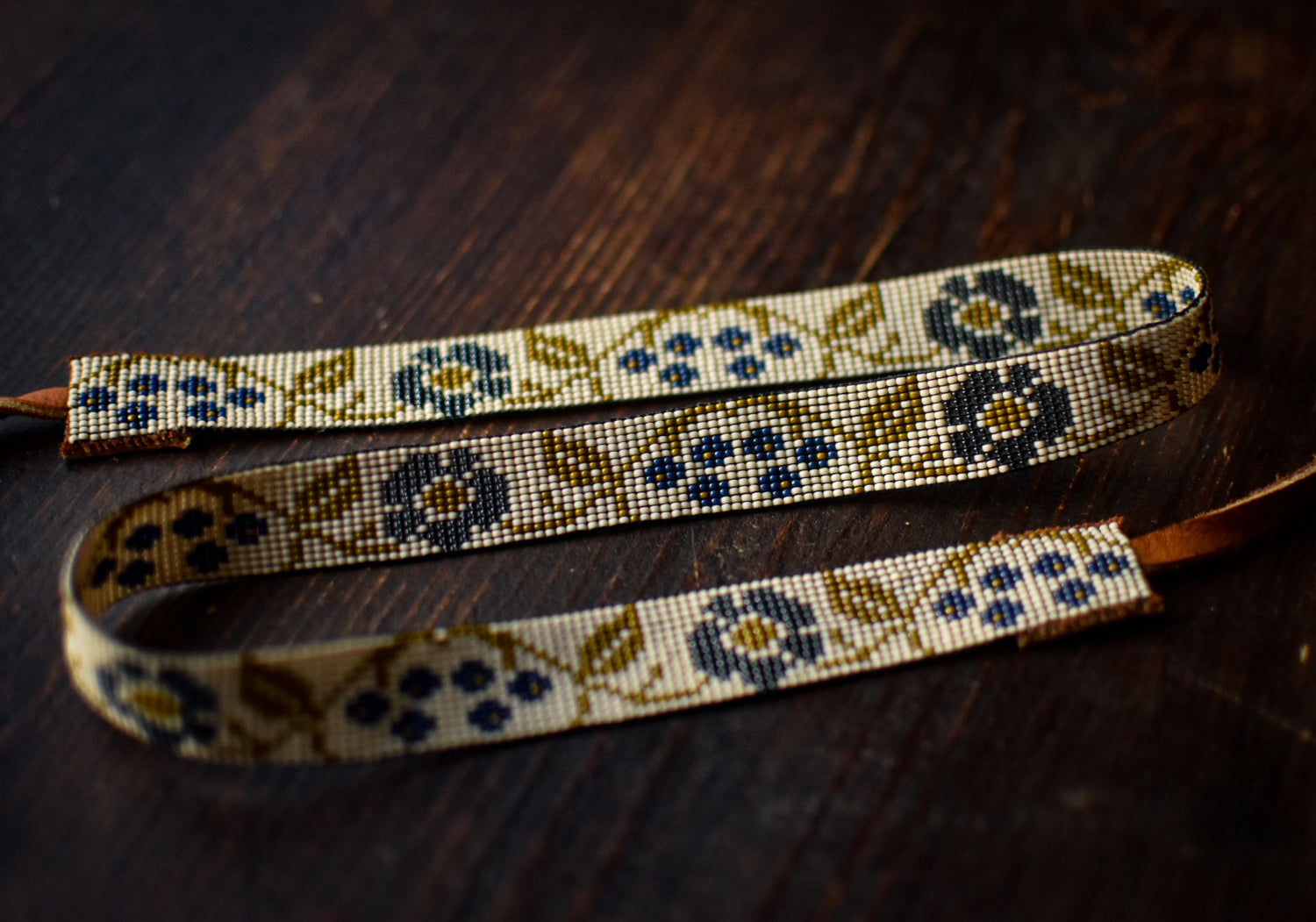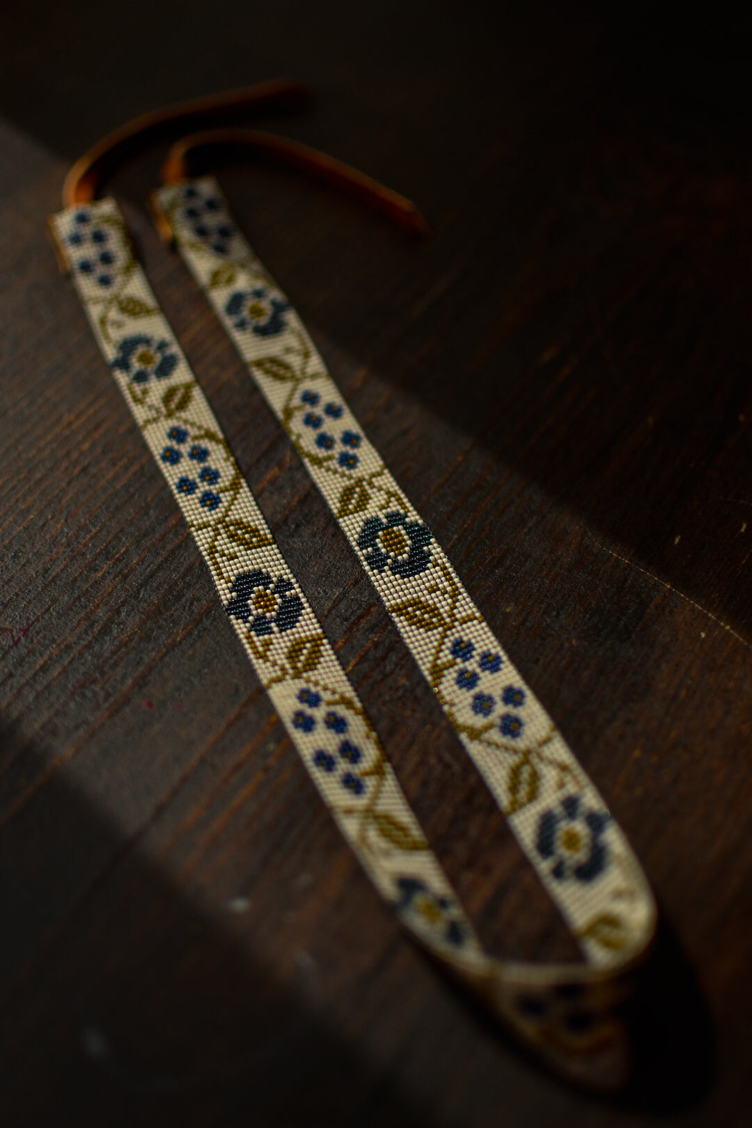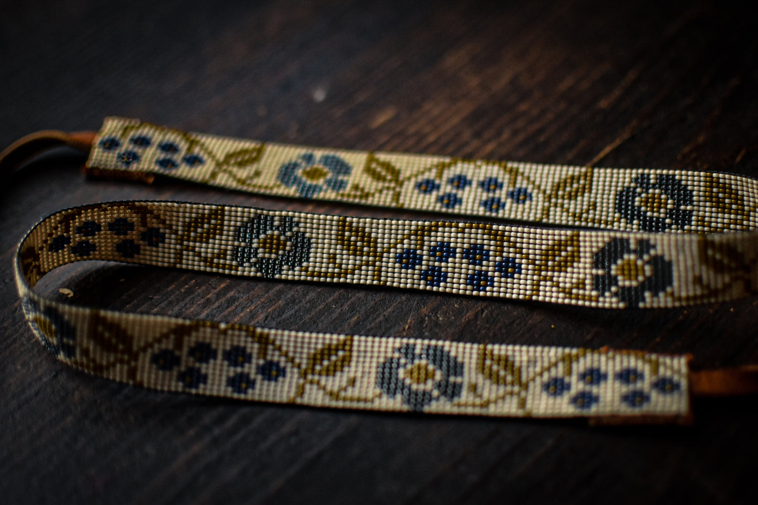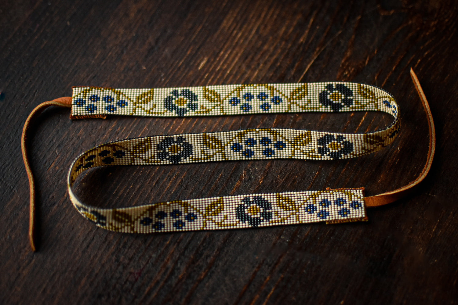 White, navy blue, translucent blue, and olive glass beads with tobacco colored American elk hide leather ties.