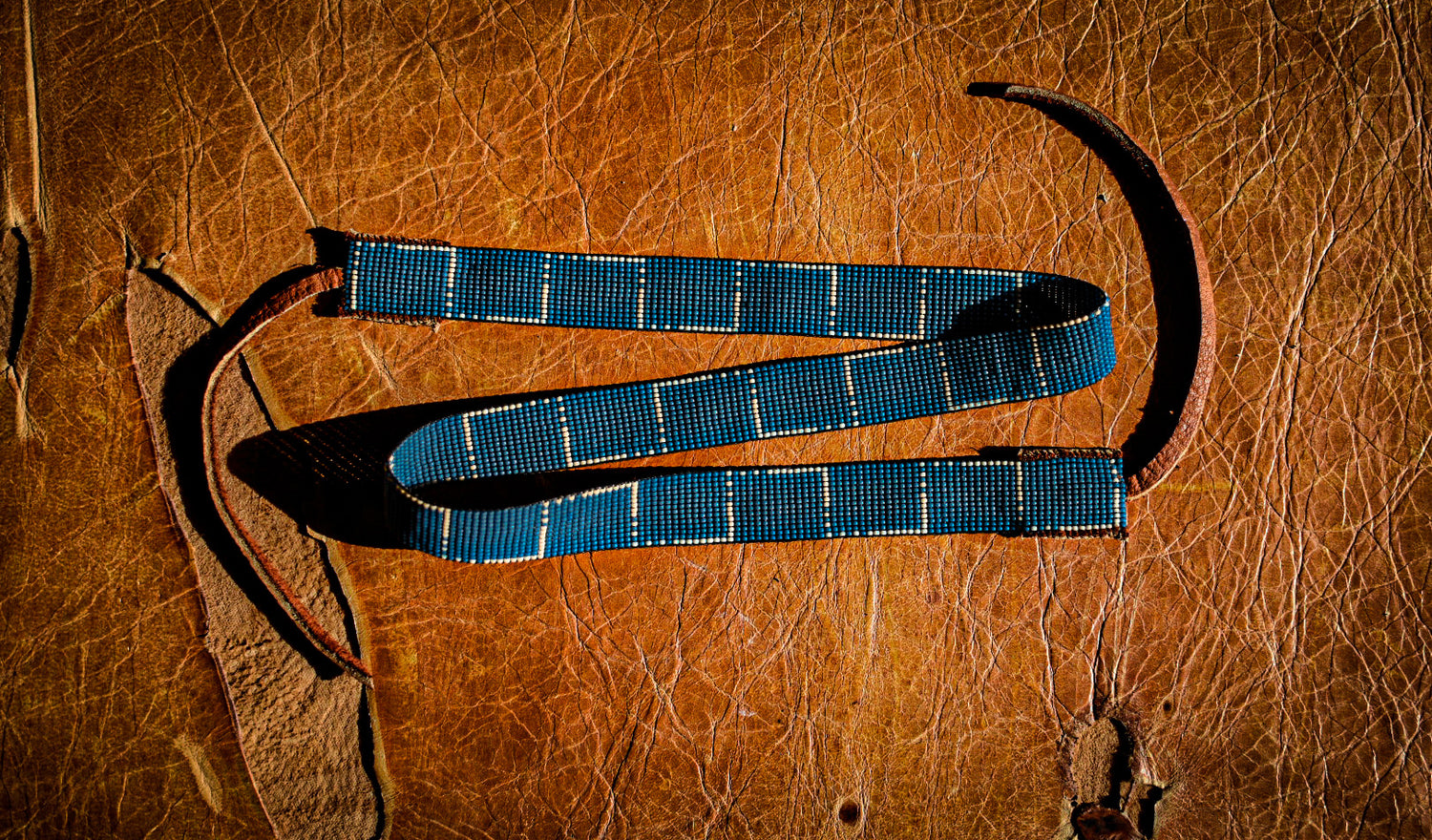 Blue + white glass beads with tobacco colored American elk hide leather ties.
