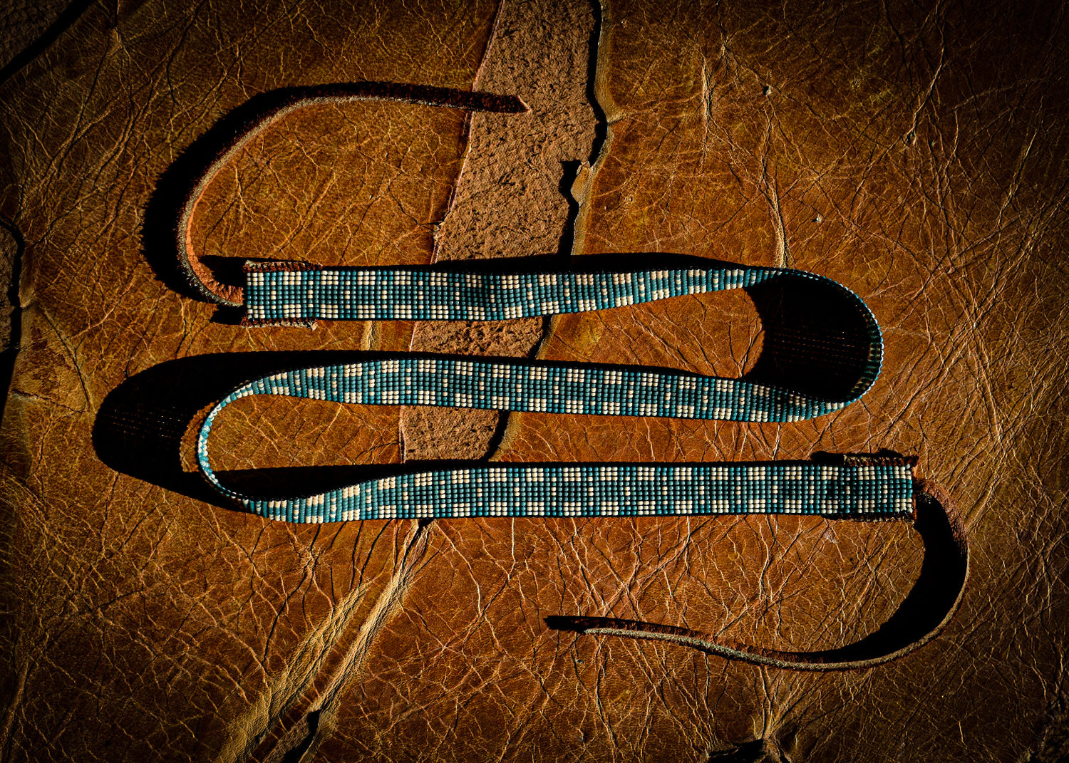 Blue + white glass beads with tobacco colored American elk hide leather ties.