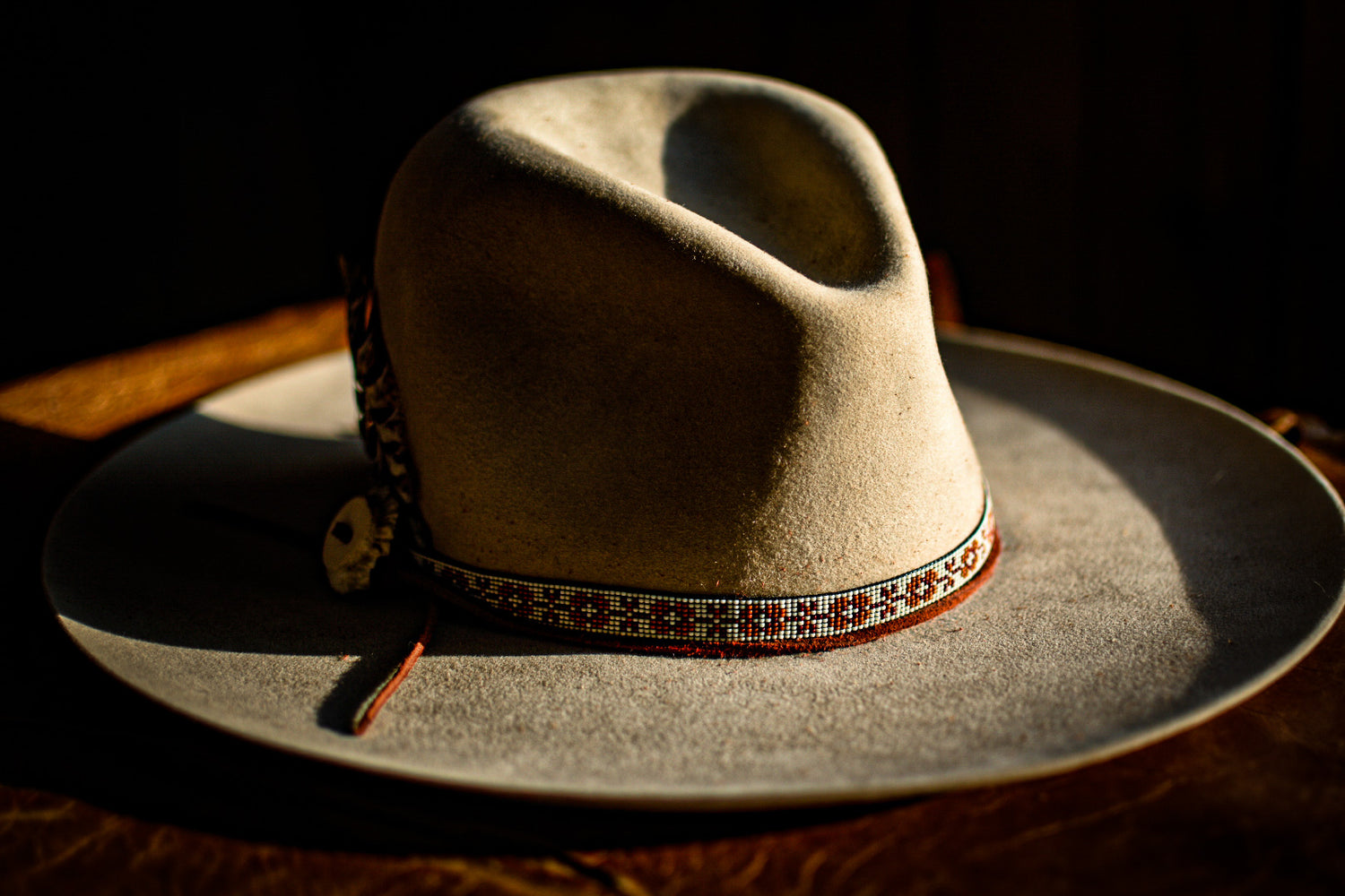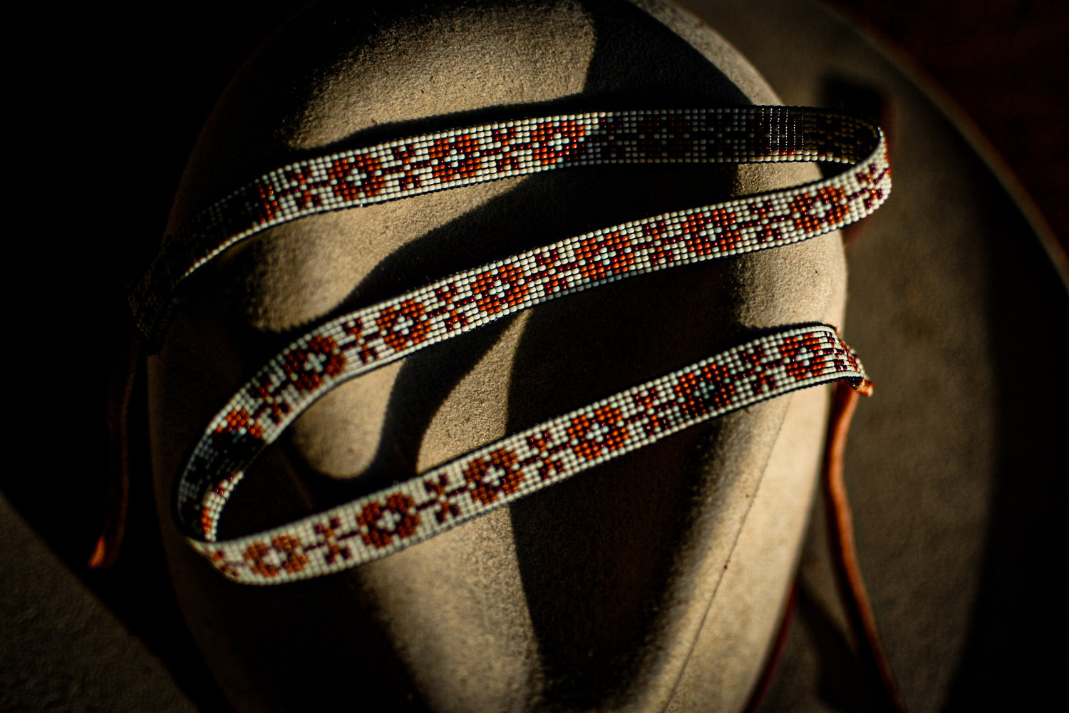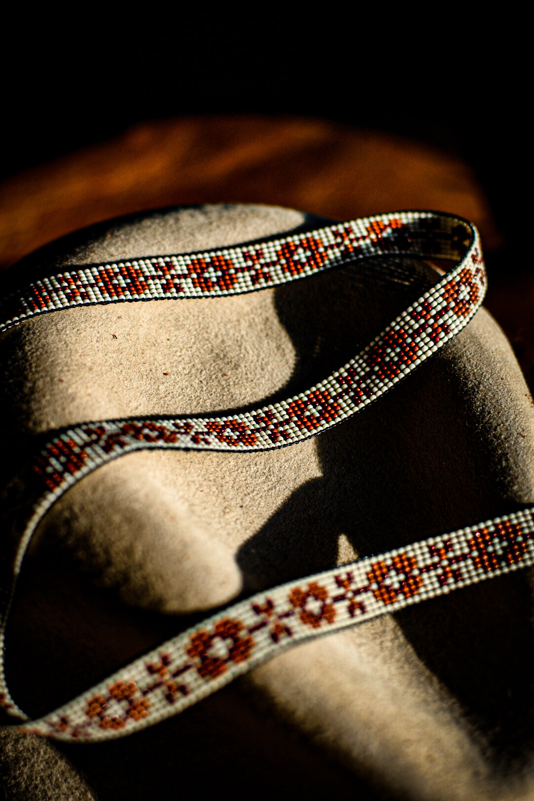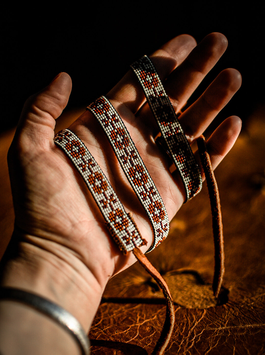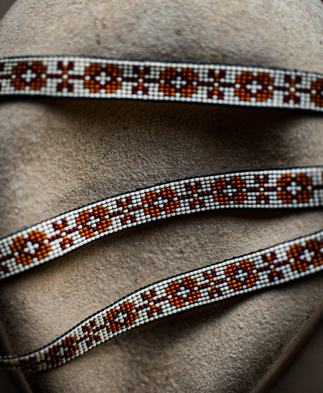 White, red and orange glass beads with tobacco colored American elk hide leather ties.