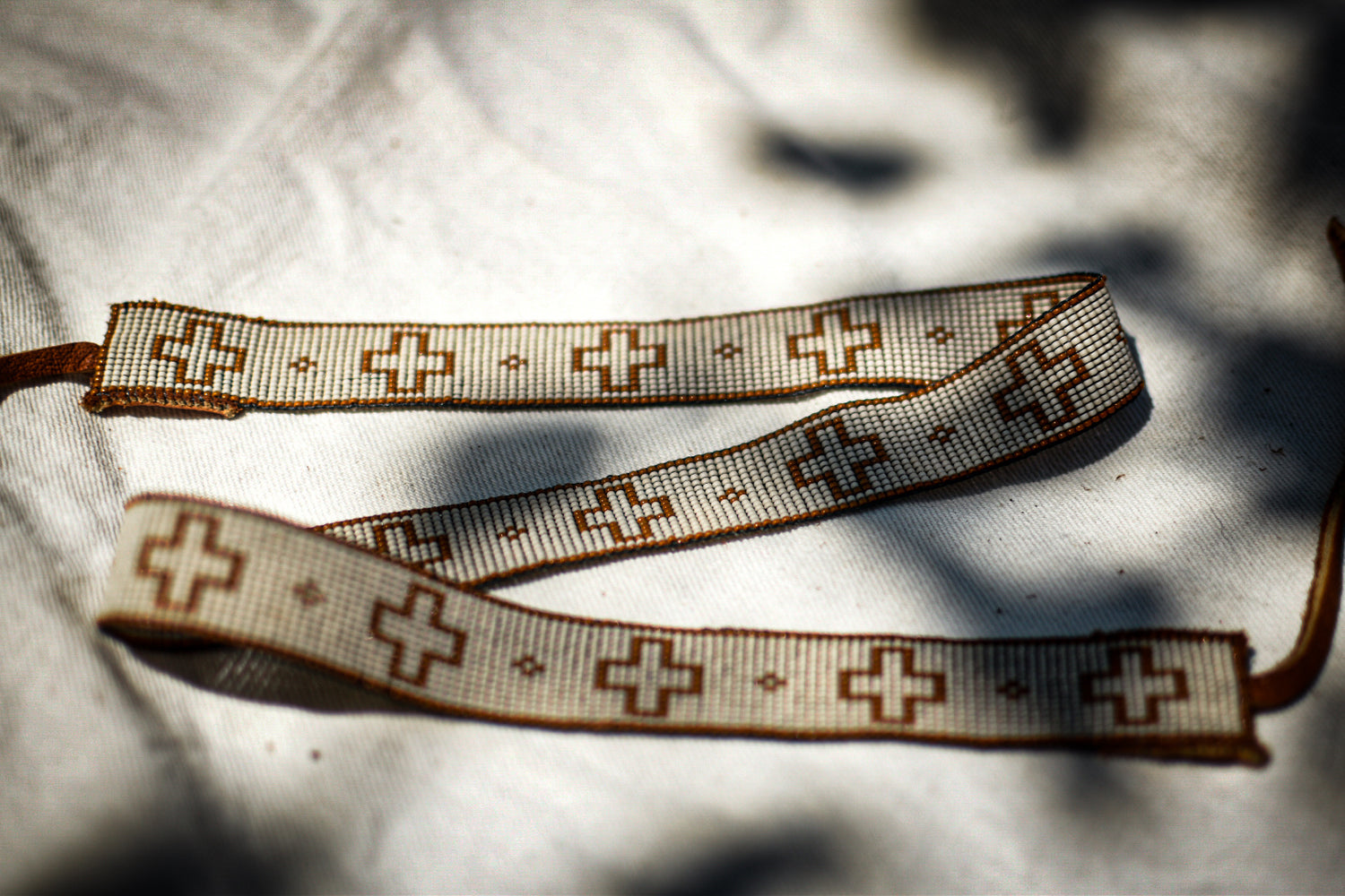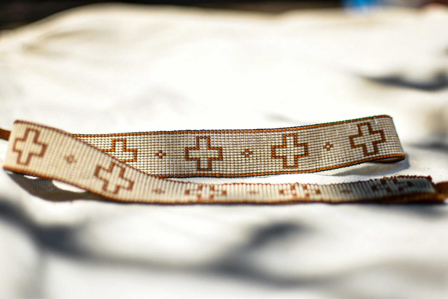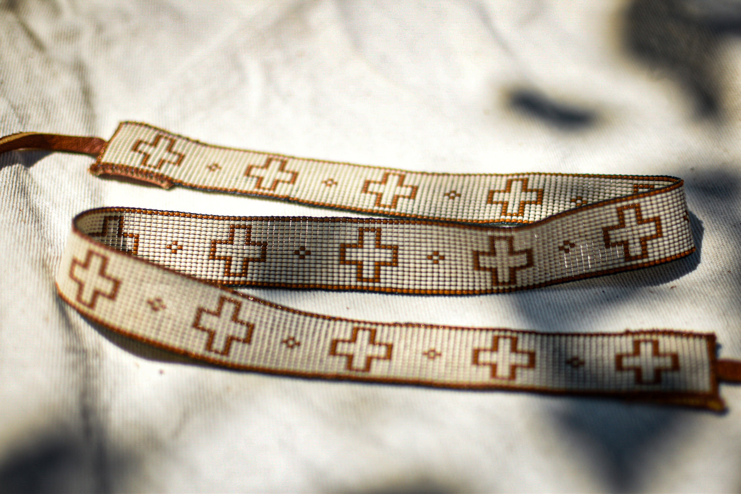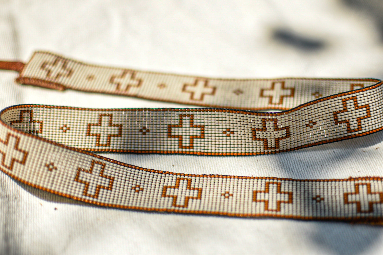 Brown and white glass beads with tobacco colored American elk hide leather ties.