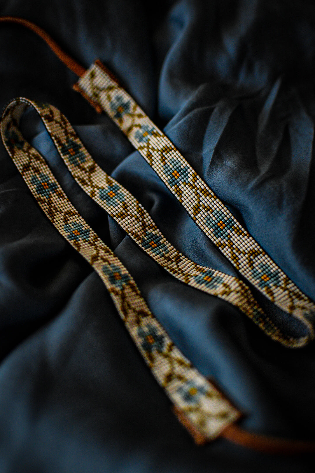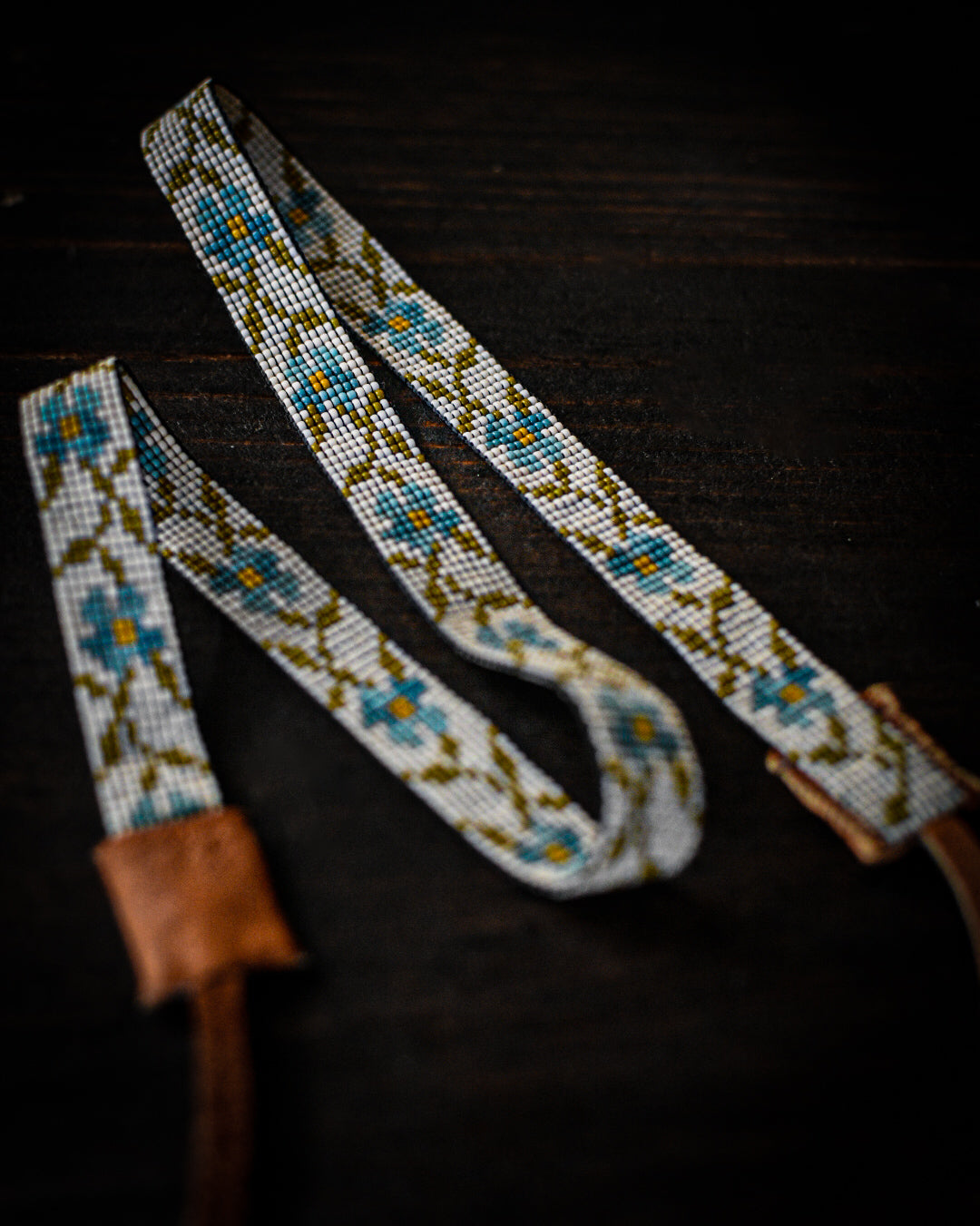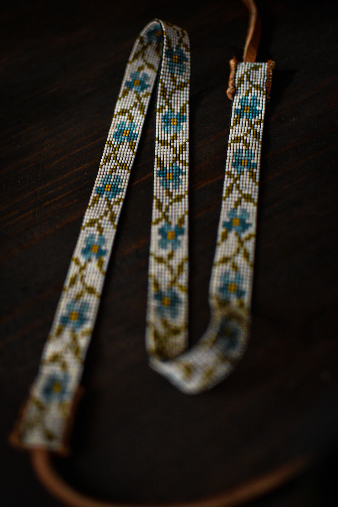 Two shades of blue, cream, and olive green glass beads with tobacco colored American elk hide leather ties.