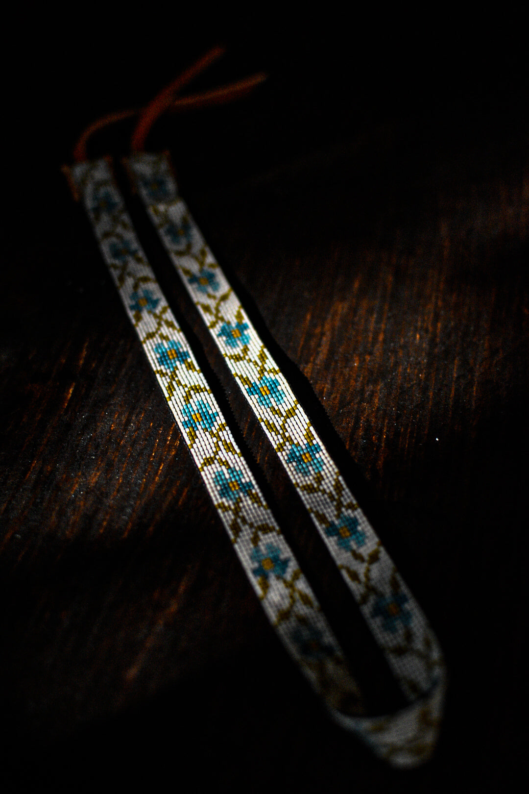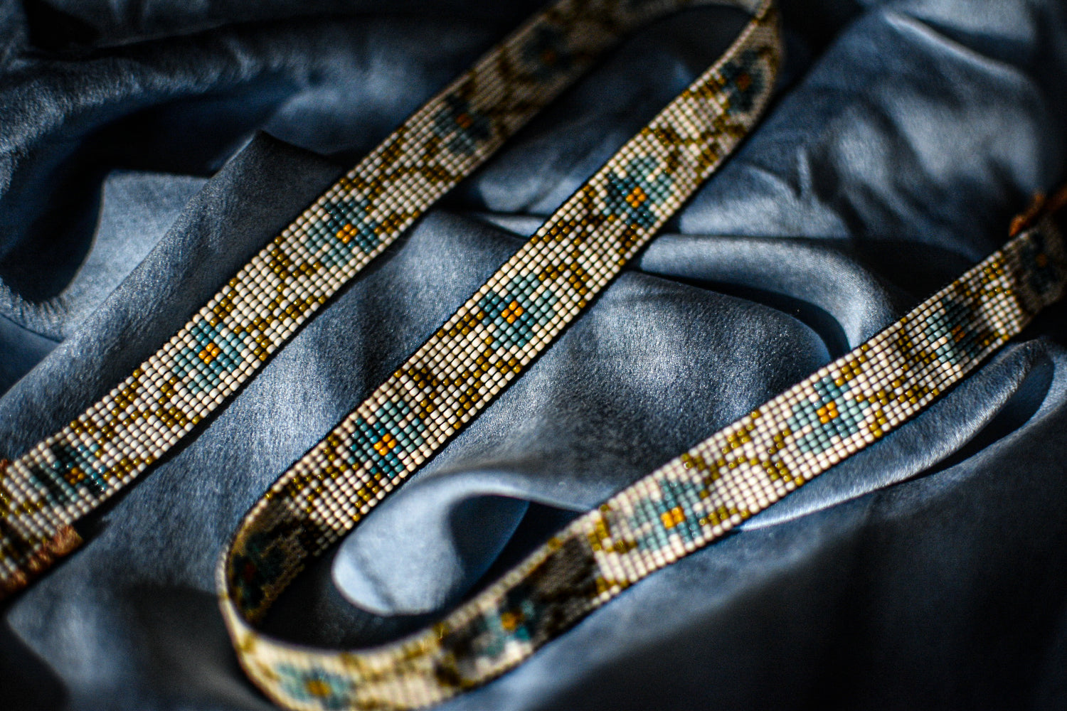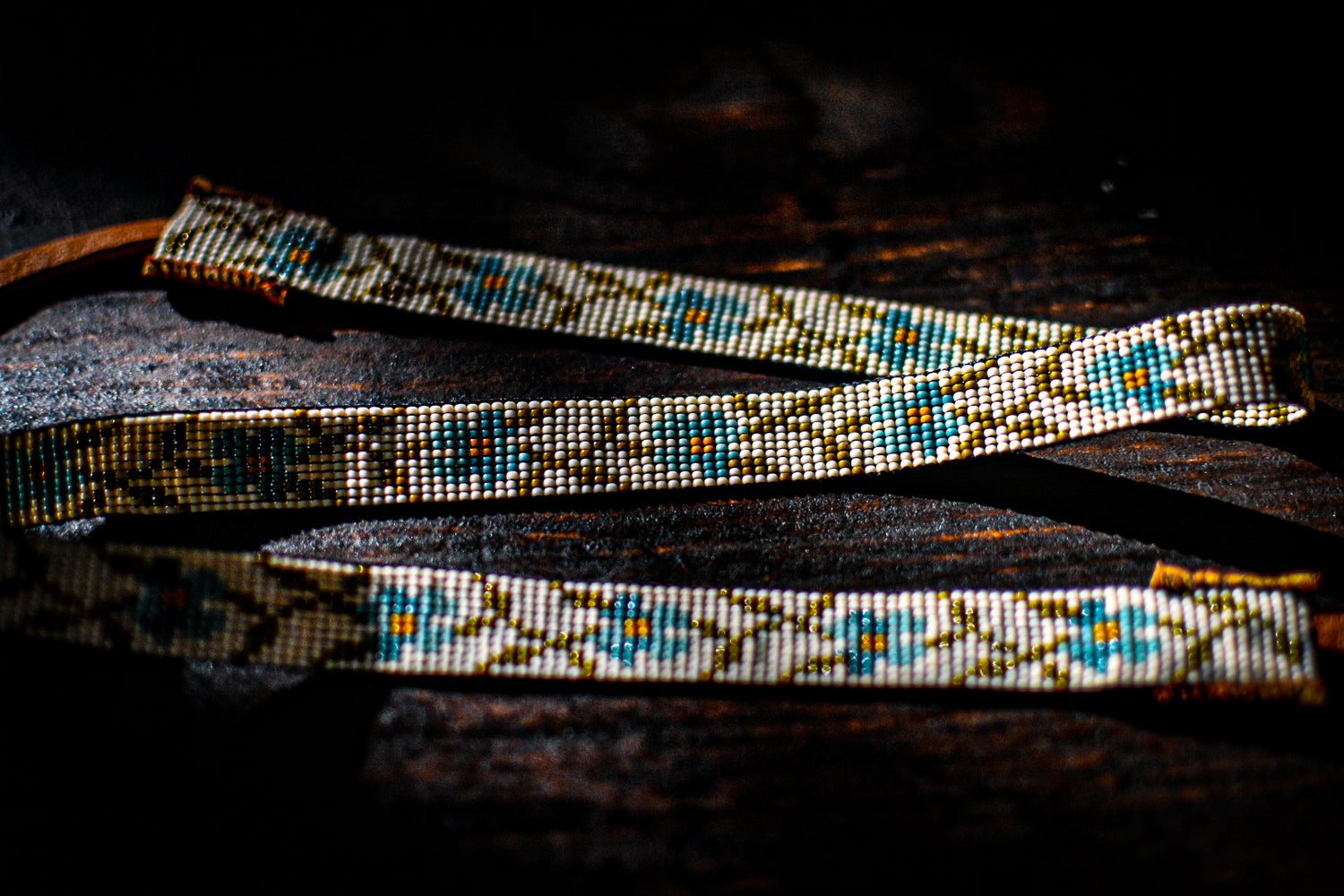 Two shades of blue, cream, and olive green glass beads with tobacco colored American elk hide leather ties.