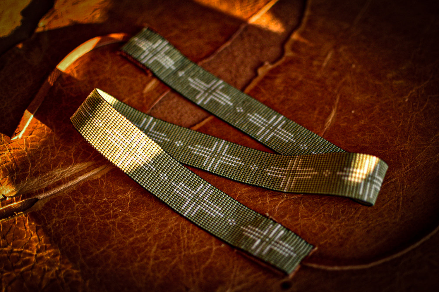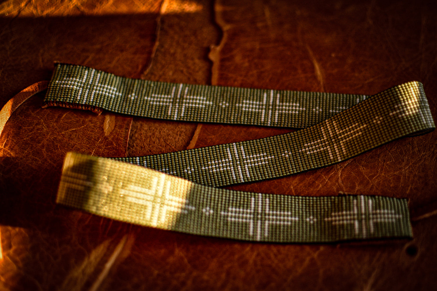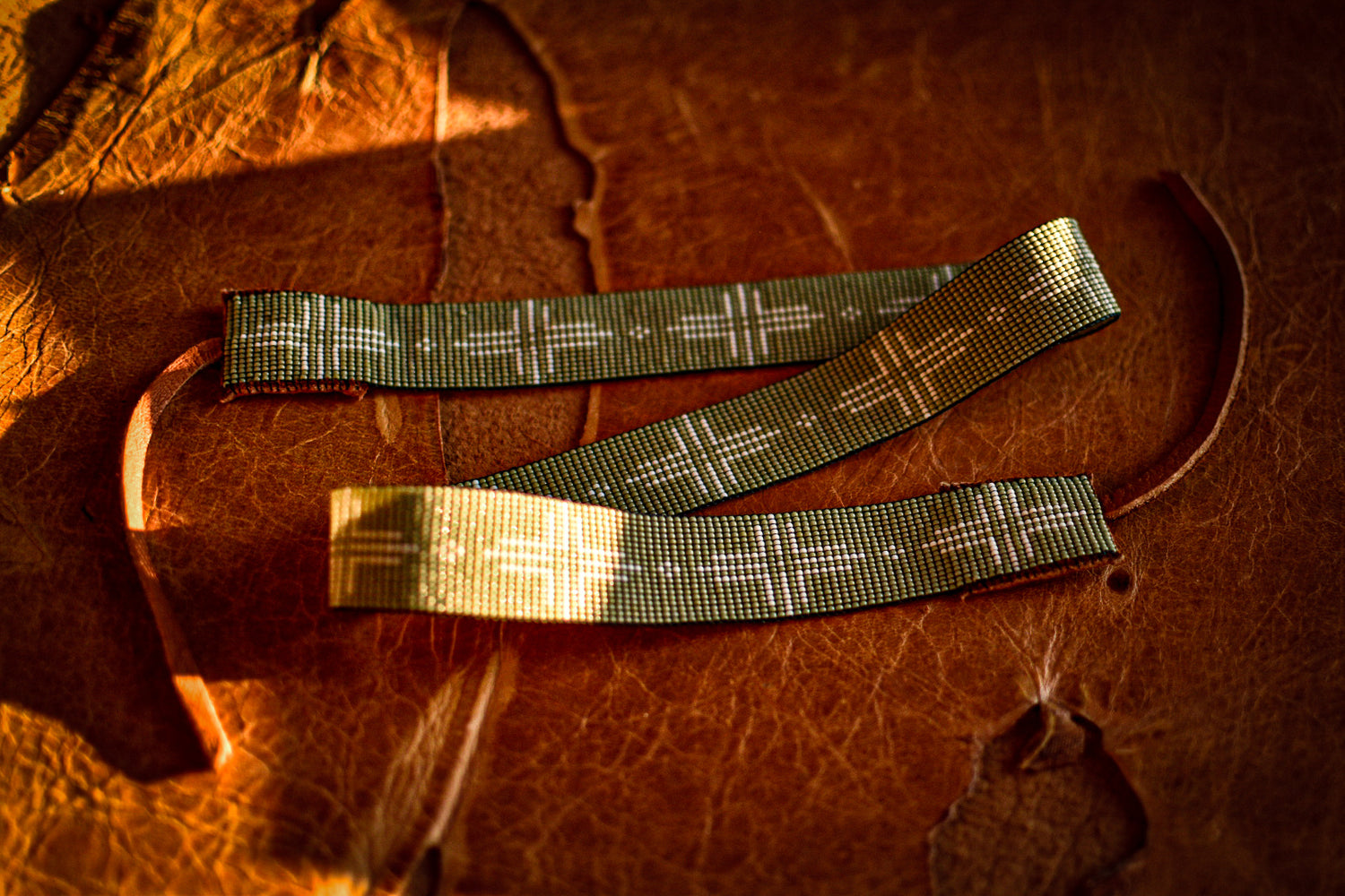Sage green and cream glass beads with tobacco colored American elk hide leather ties.