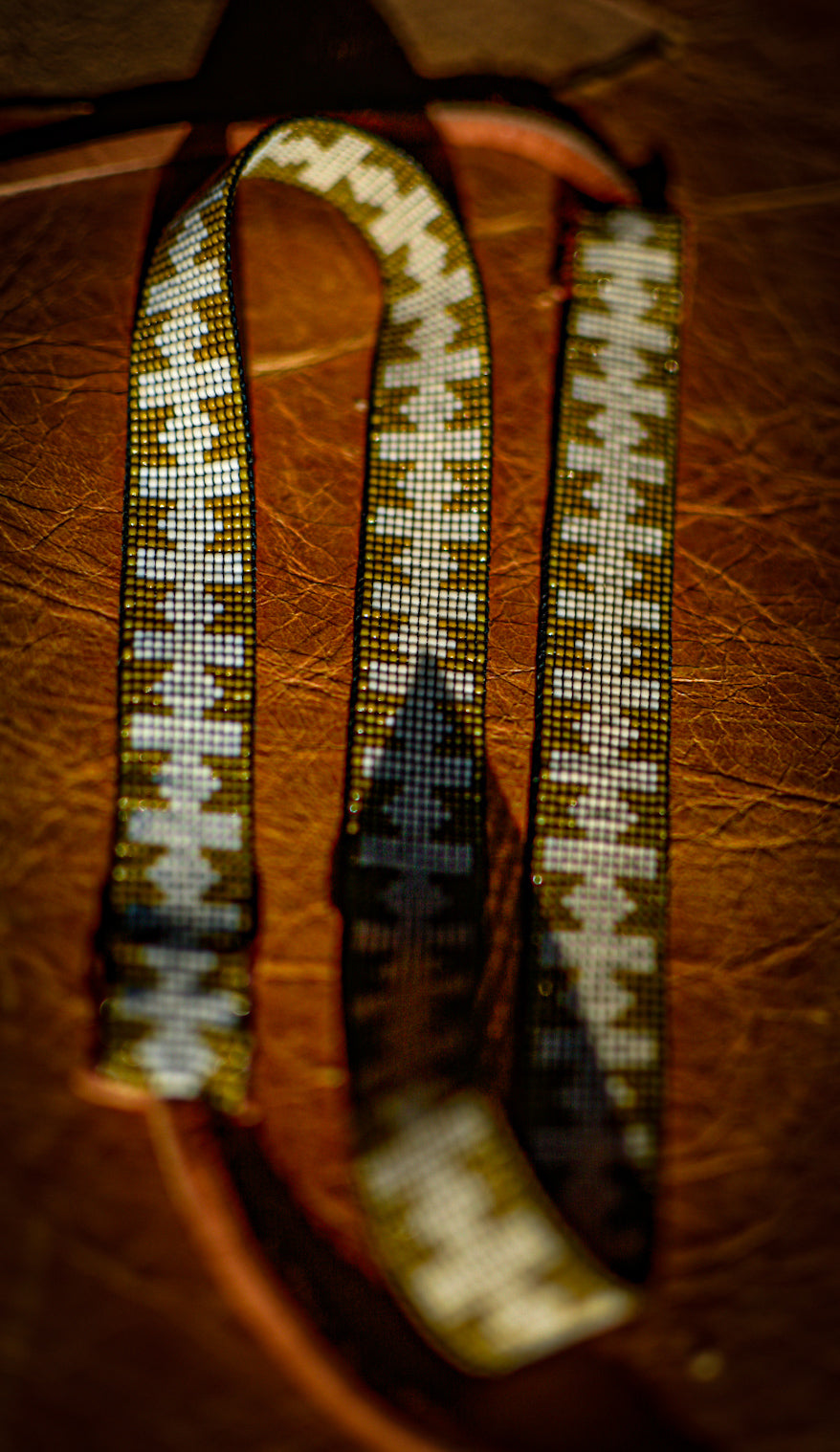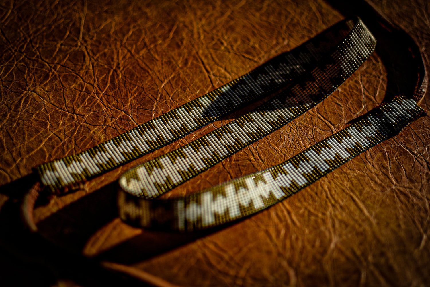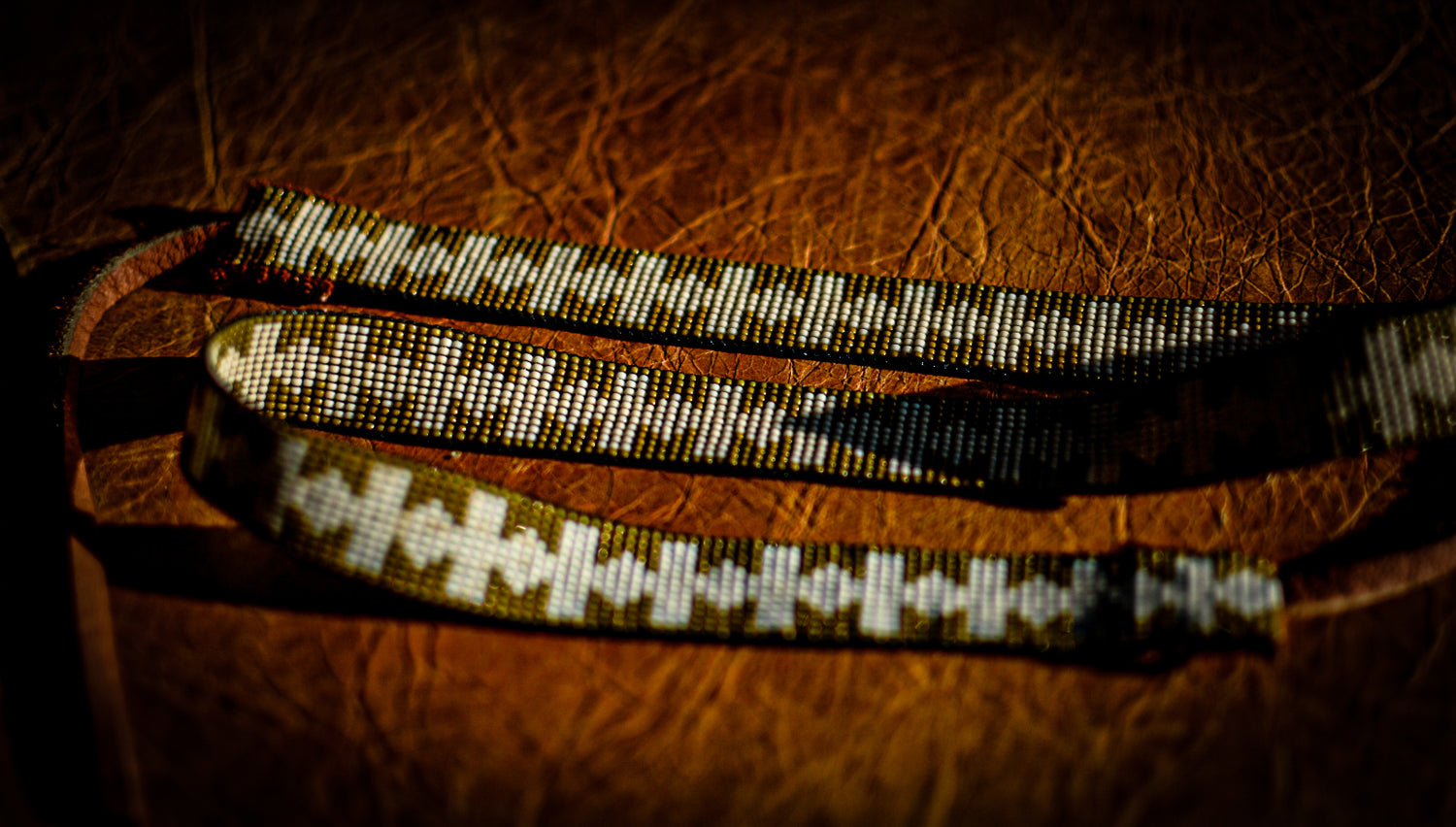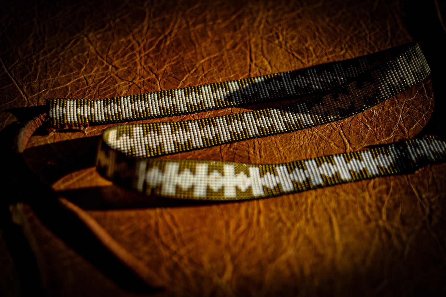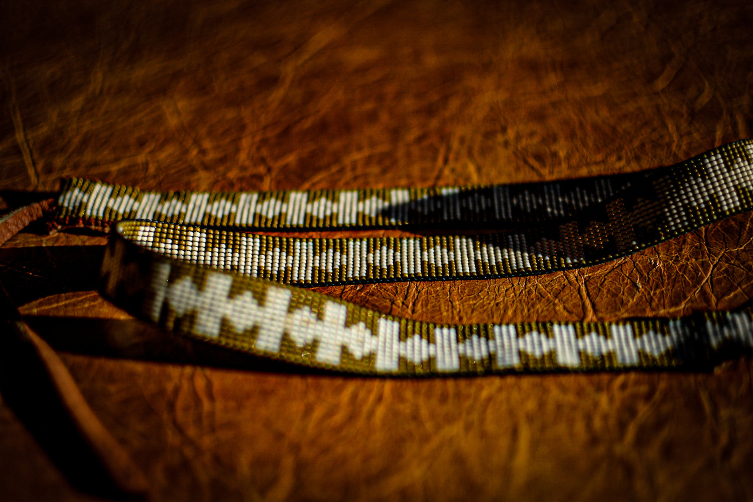 Olive and cream glass beads with tobacco colored American elk hide leather ties.
