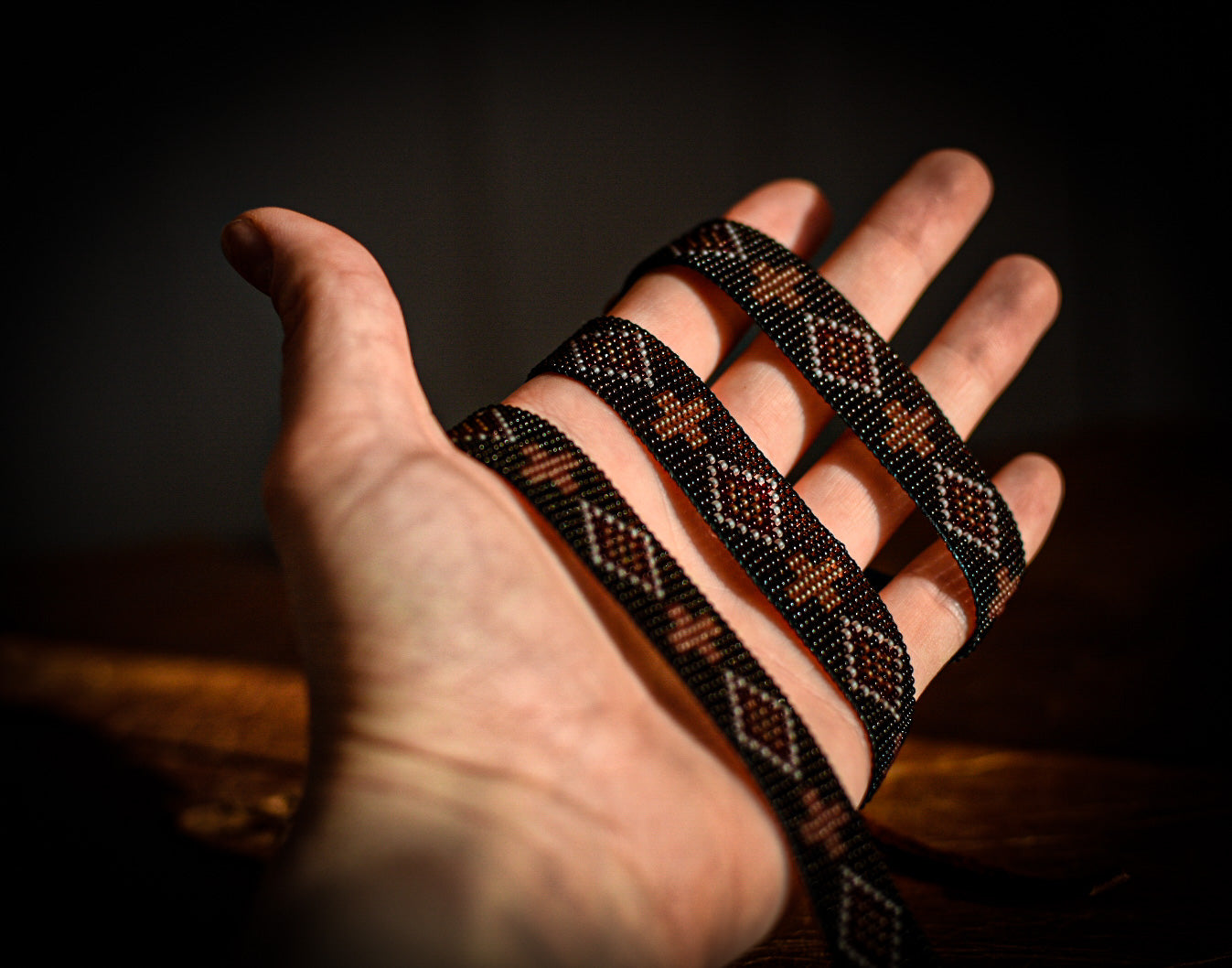 Transparent chocolate, ruby, transparent + cinnamon glass beads with tobacco colored deer hide leather ties. Made by hand with the intention of being heirloom quality in Montana, USA.
