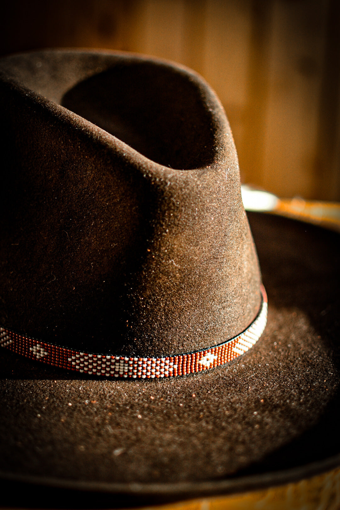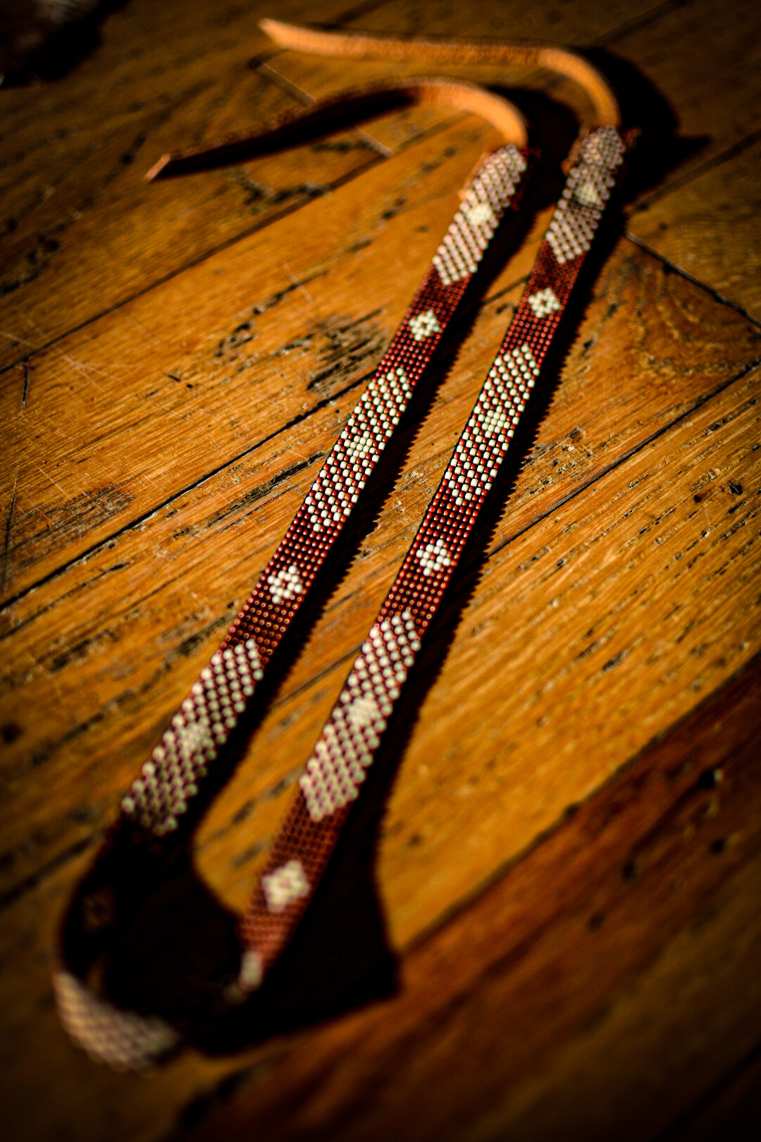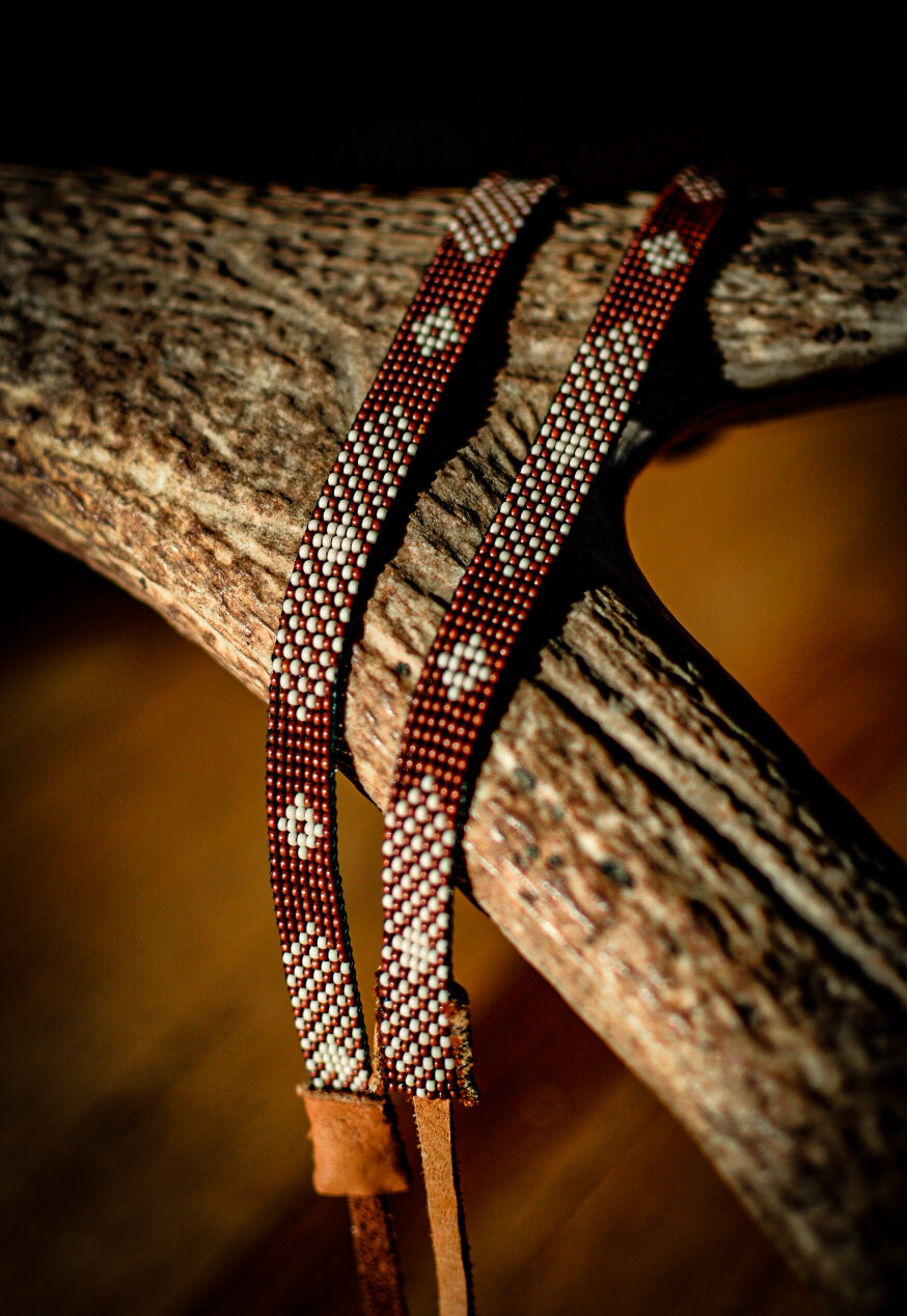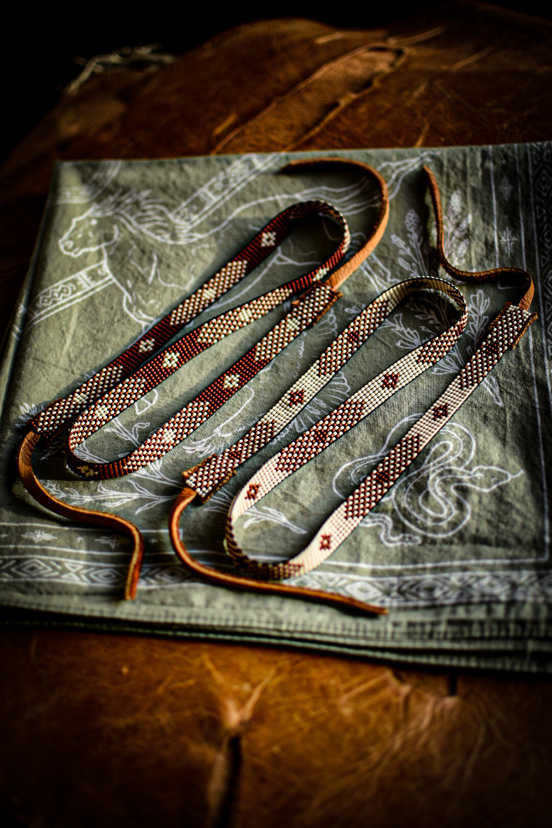 Brown + white glass beads with tobacco colored American elk hide leather ties.