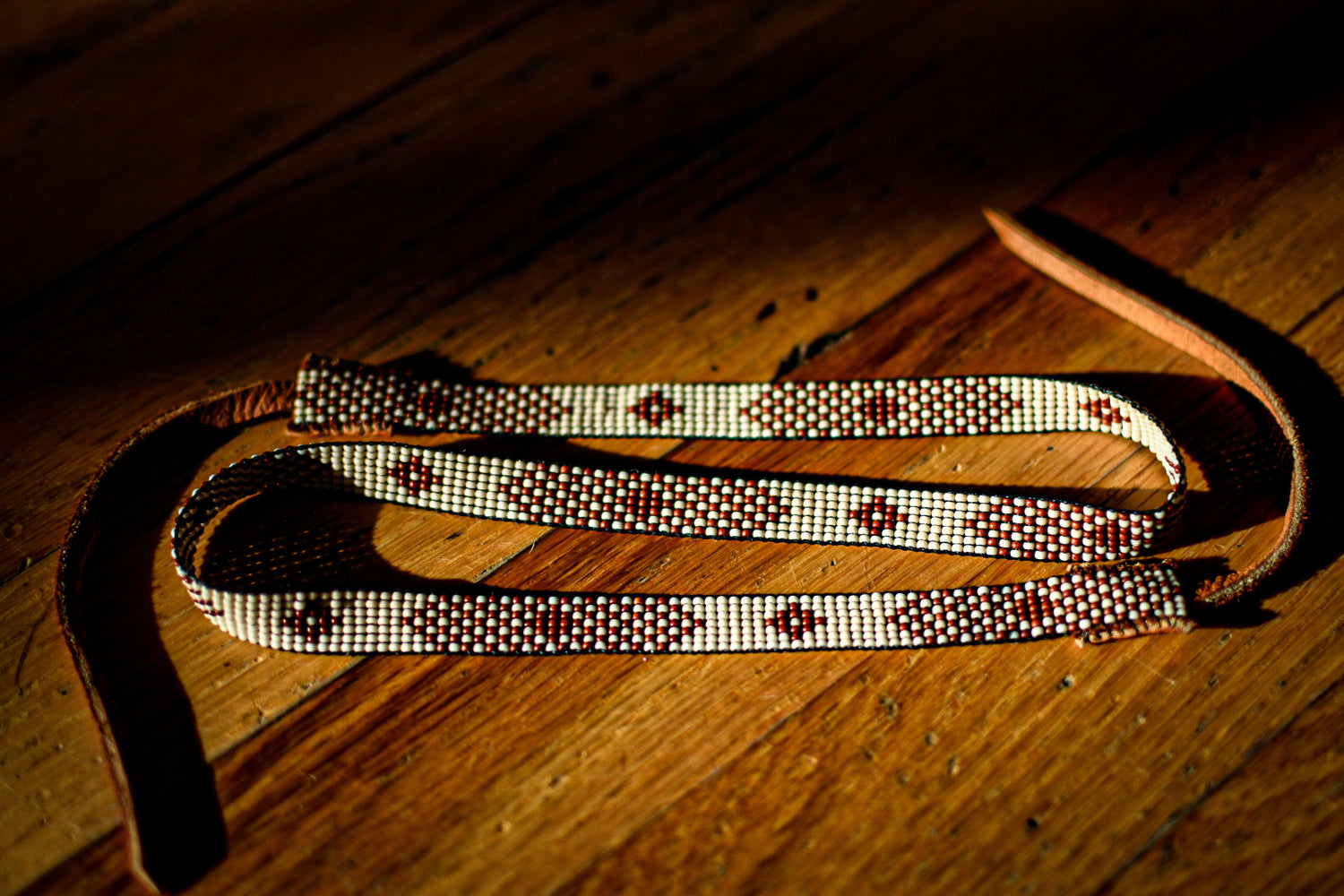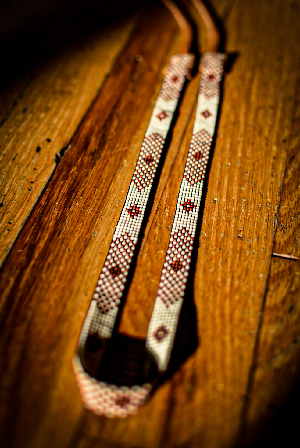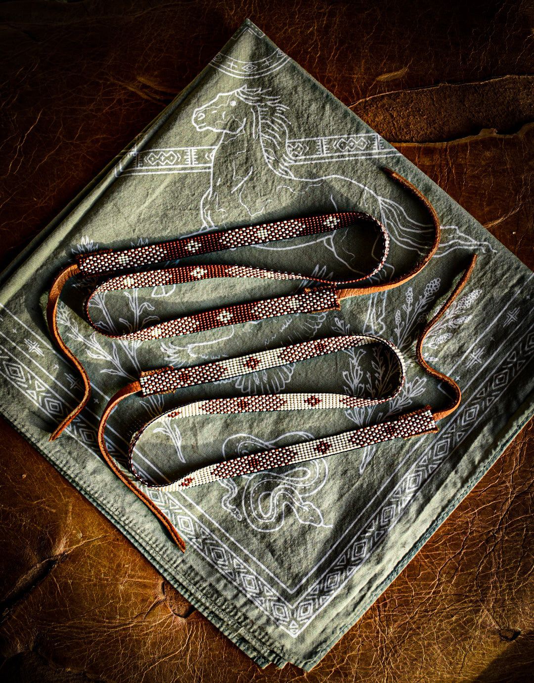 Bone and rusty brown glass beads with tobacco colored American elk hide leather ties.
