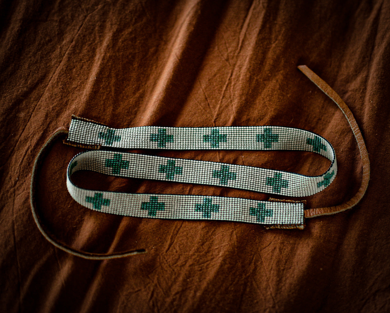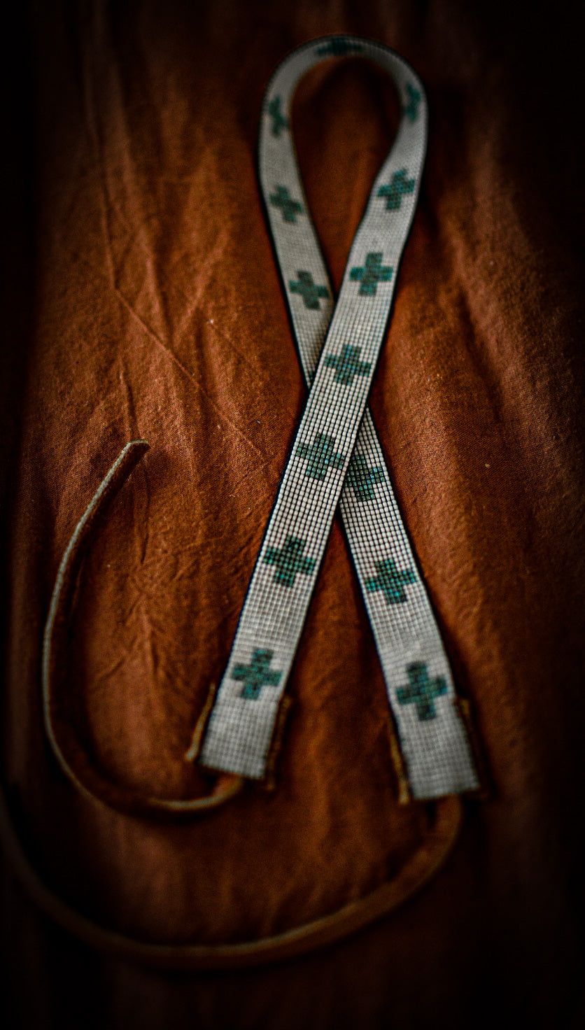 White + turquoise glass beads with tobacco colored American elk hide leather ties.