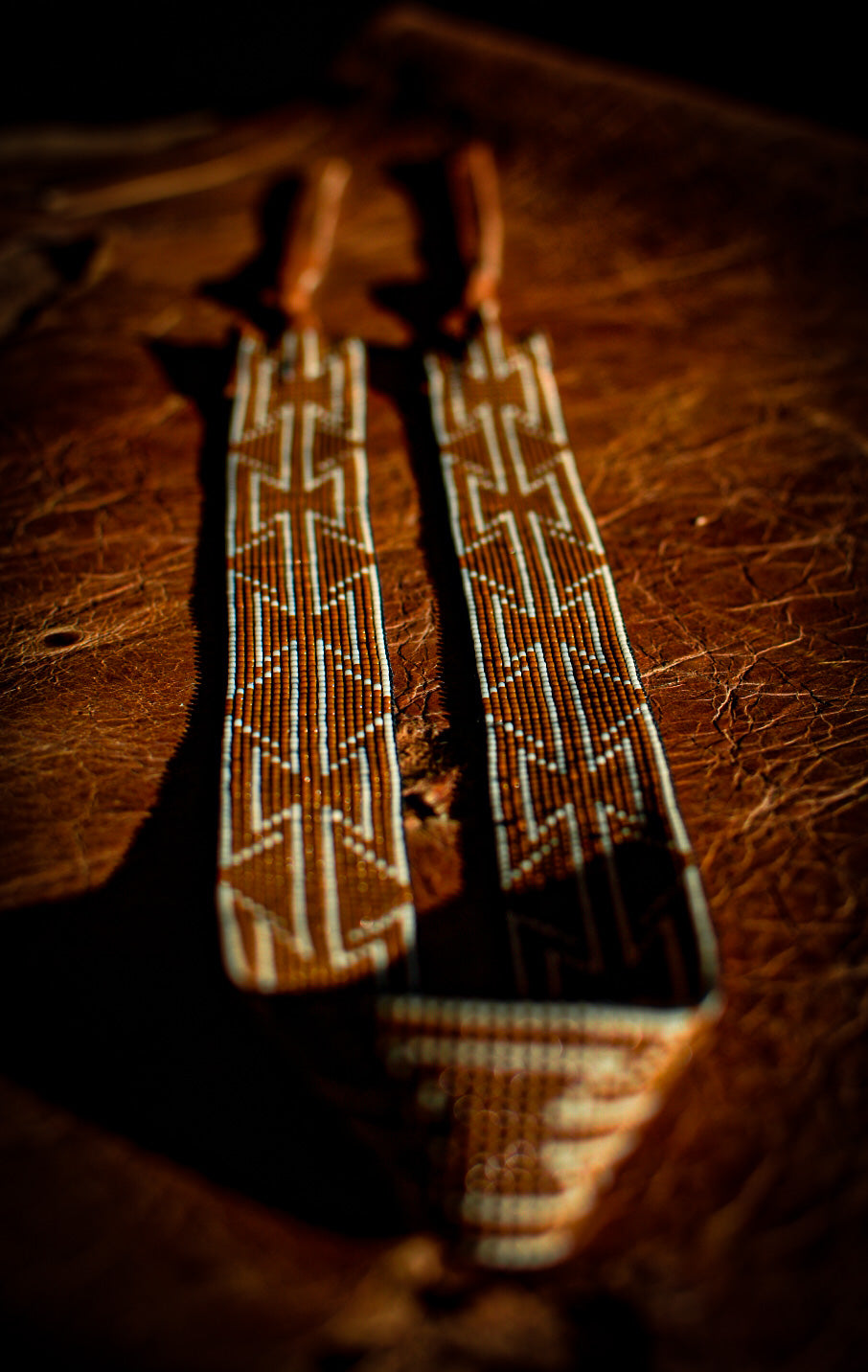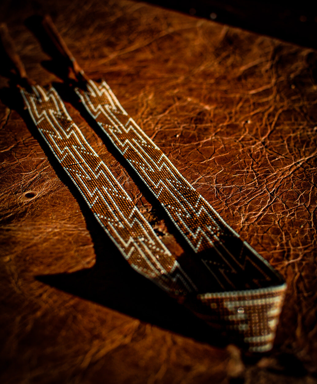 Light brown + “bone” colored glass beads with tobacco colored American elk hide leather ties.