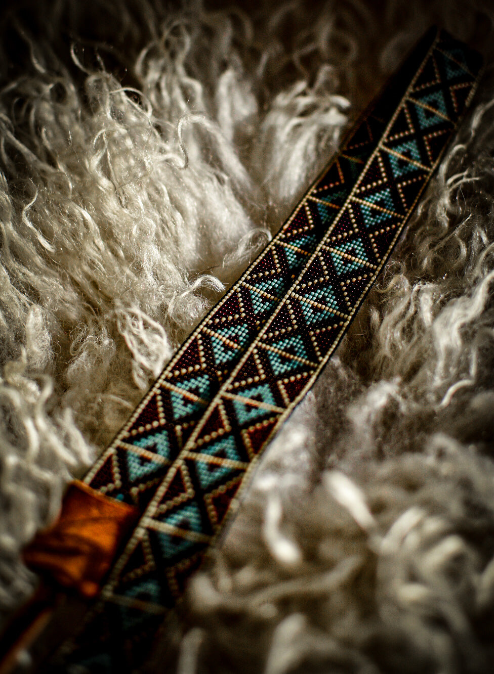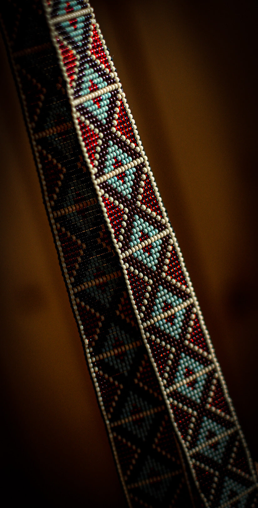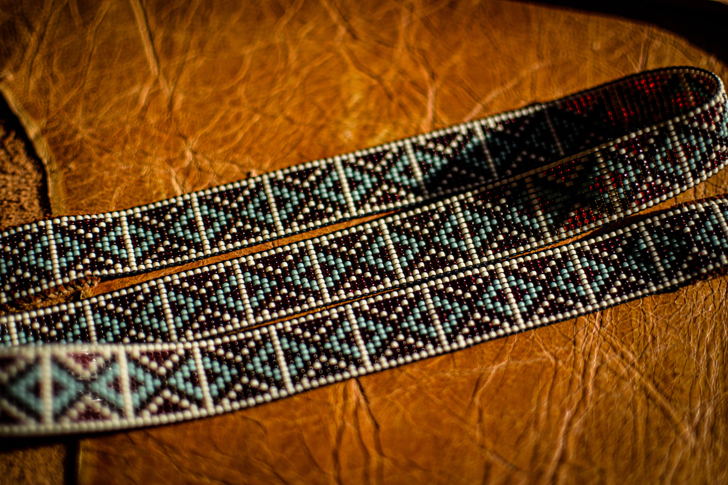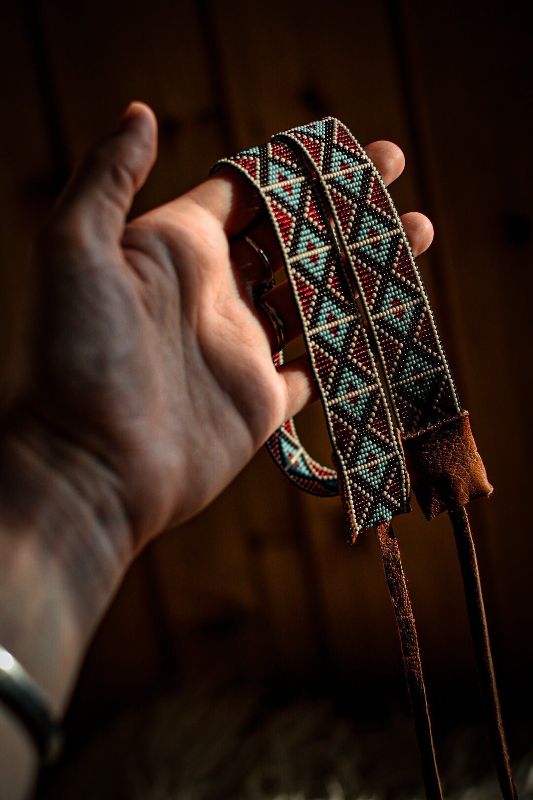 Transparent garnet red, turquoise, white and brown glass beads with tobacco colored American elk hide leather ties.
